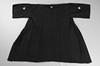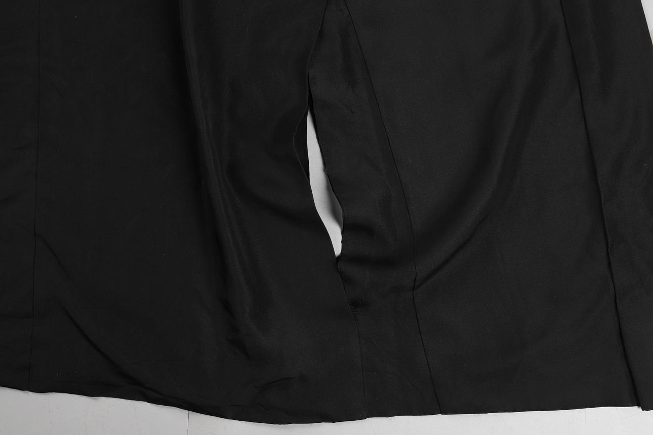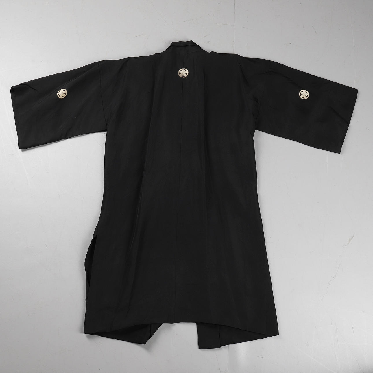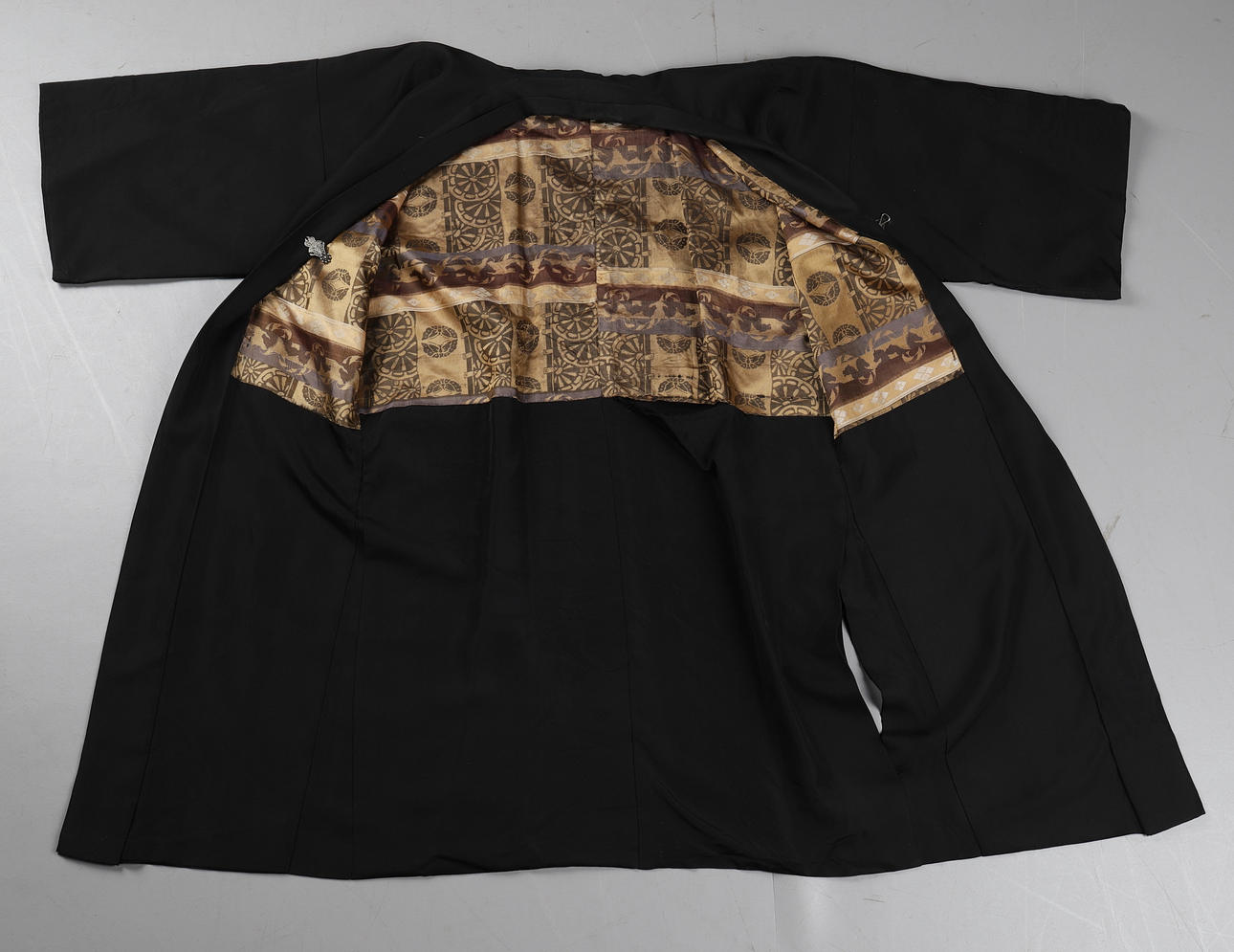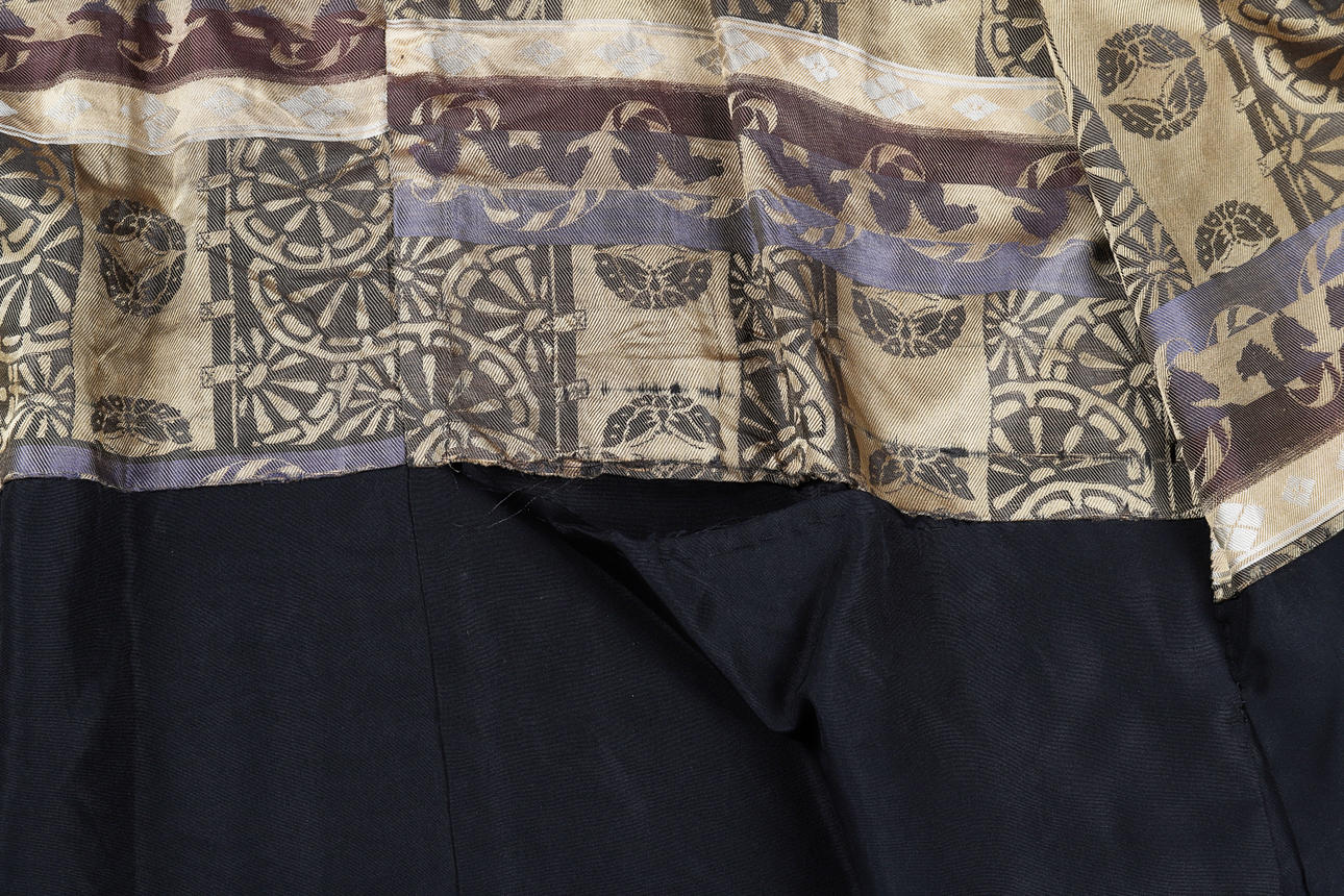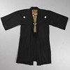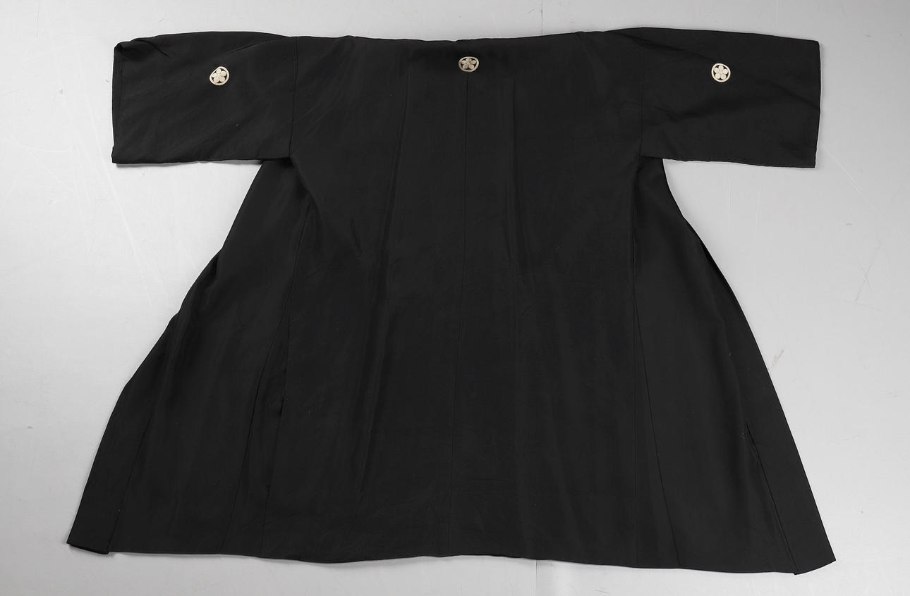 i svart siden med beige kamonsymboler på kista och rygg, håller ihop med ett graverat metallspänne, ärmar och överdel fodrad med traditionellt mönstrad siden och lägre konst med svart siden. Rygglängd 99cm, armlängd 32cm, bystbredd ca 100 cm.