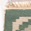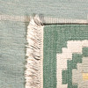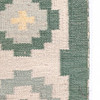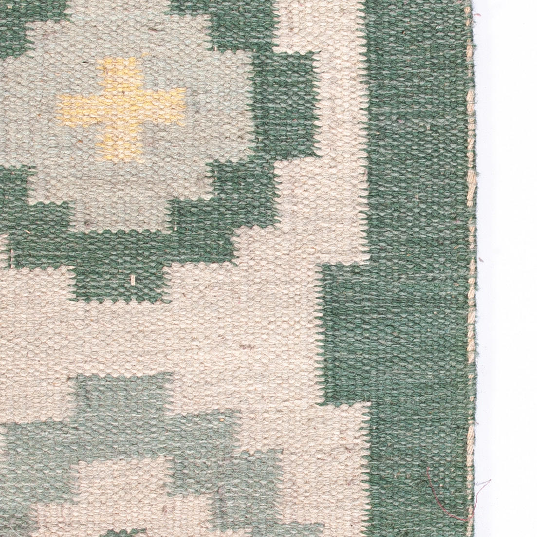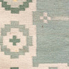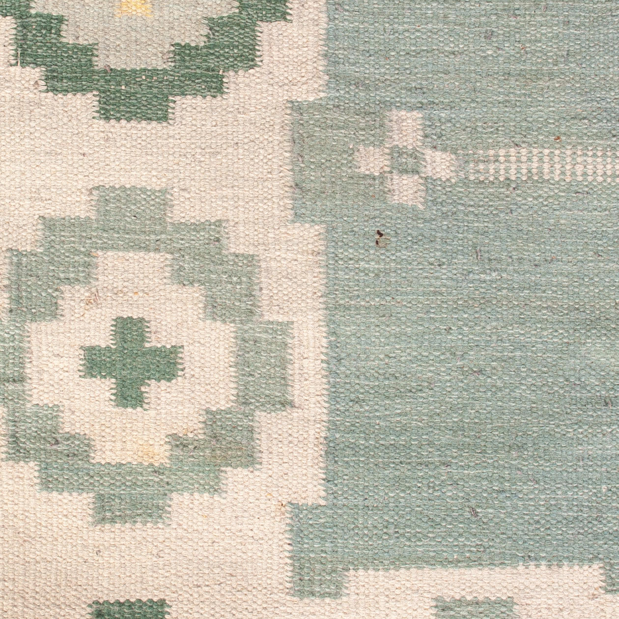 ljus botten med grönblå nyanser, geometriskt mönster i gult och vitt.