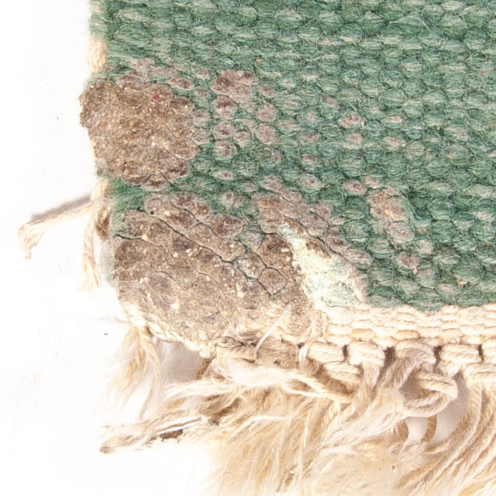 fläckar, sliten kant, slitna fransar, intrampad massa i ena hörnet.