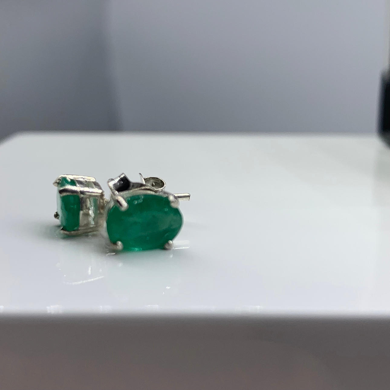 Var och en av dubbarna är inställd med en singel, ovalslipad smaragd av 8 x 6 mm, ca.