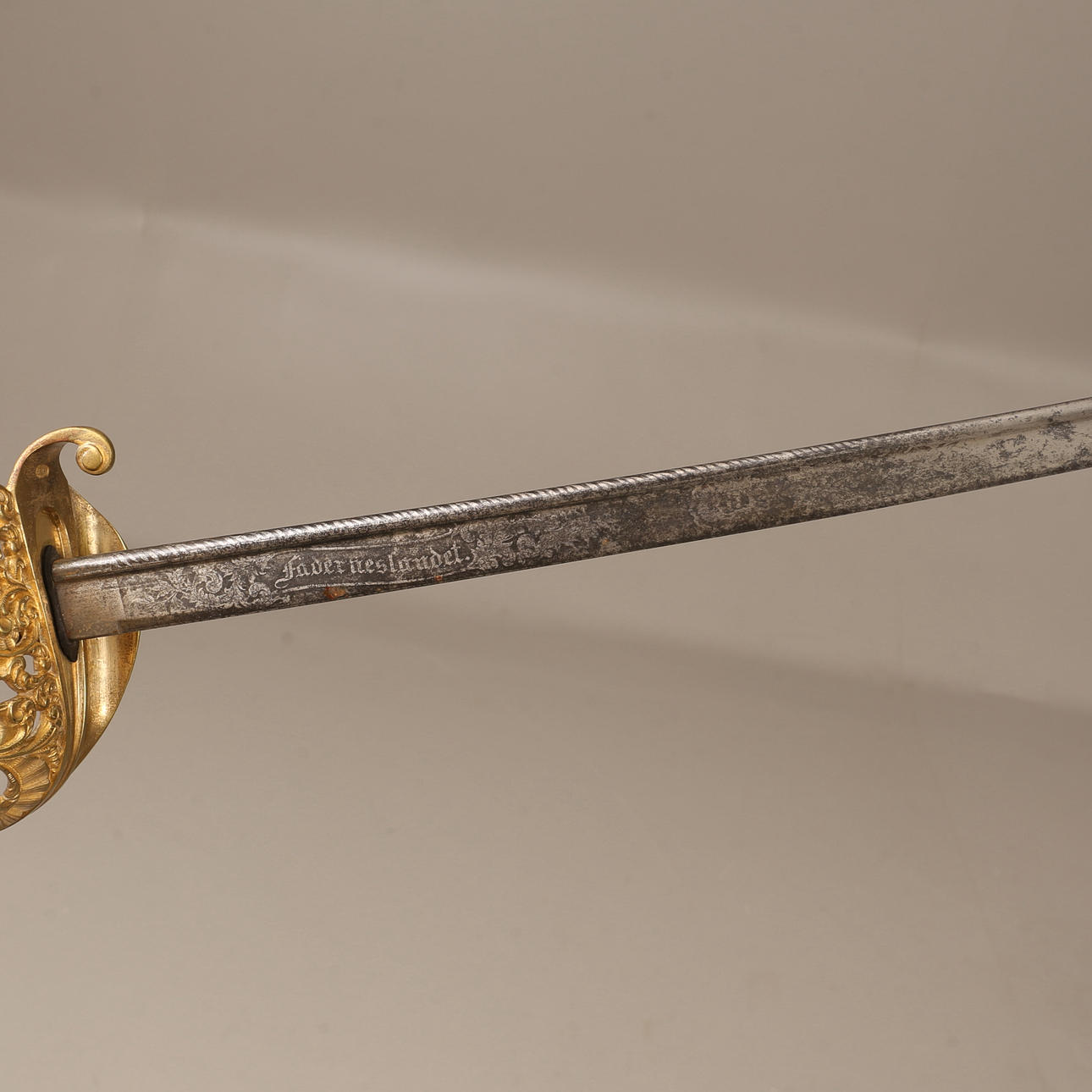 Svensk sabel m/1859 för officer. Etsad dekor på klinga med texten "Fäderneslandet". Total längd cirka 89 cm. Märkt JAEK.