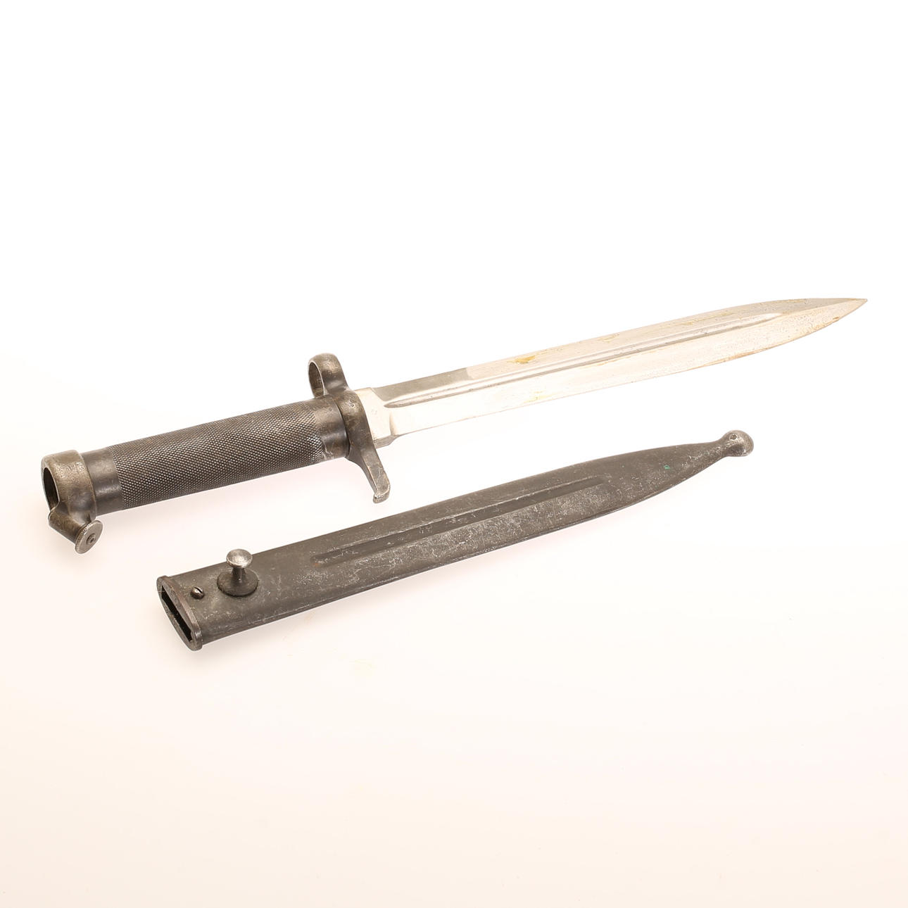 Bajonett för svenskt mausergevär m/96. Tidig variant med flat infästningsknapp. Längd cirka 35 cm.