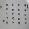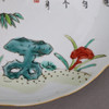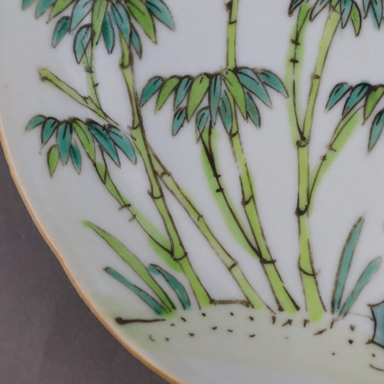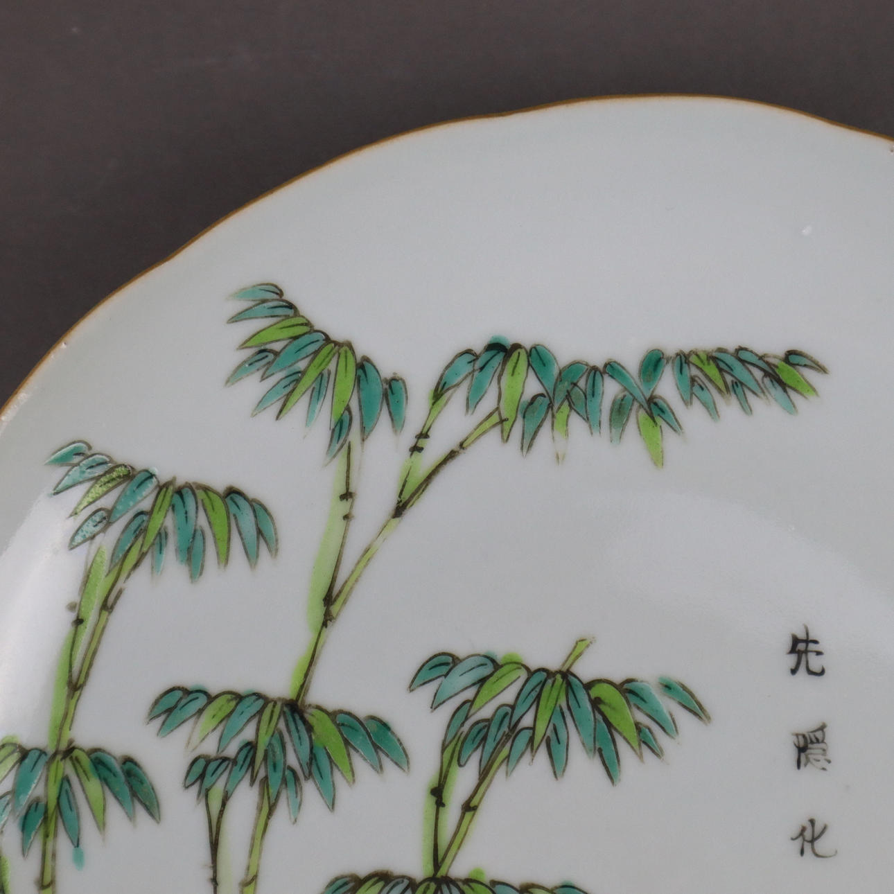 rund platta med vågig guldkant, målade i överglasyrfärger med bambu, dekorativa stenar och lingzhi-svamp samt poesilinjer i kinesisk kalligrafi (ode till bambu), fladdermusmotiv på utsidan, dm.ca. 18.2 cm, röd stämpel ”Endless Knot” på undersidan, Kina, sen Qingdynastin, Tongzhi-eran.