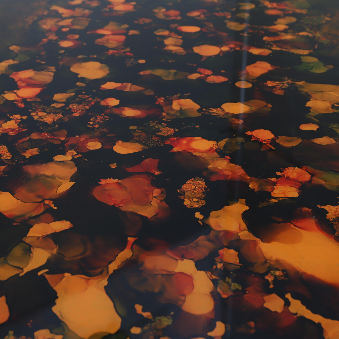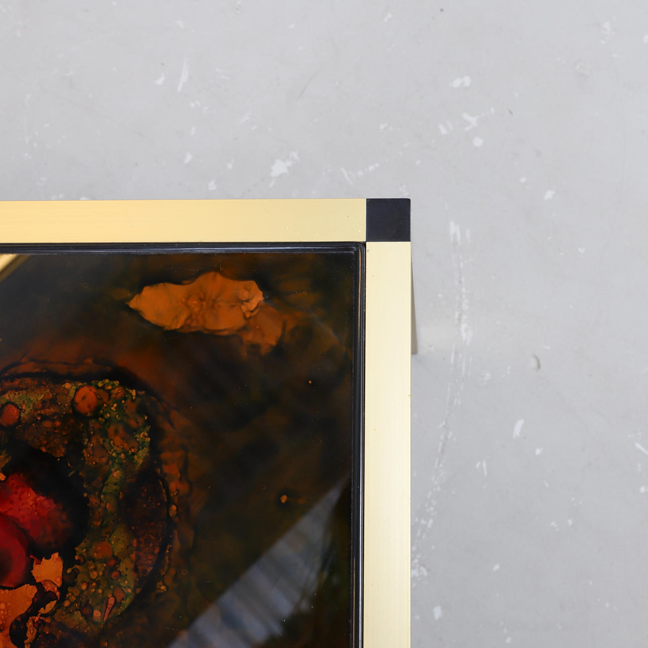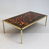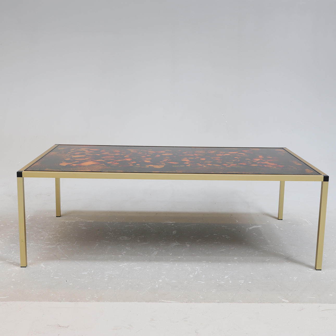Skiva i glas och laminat. Stomme i mässing. Längd 142. Bredd 83. Höjd 46 cm.