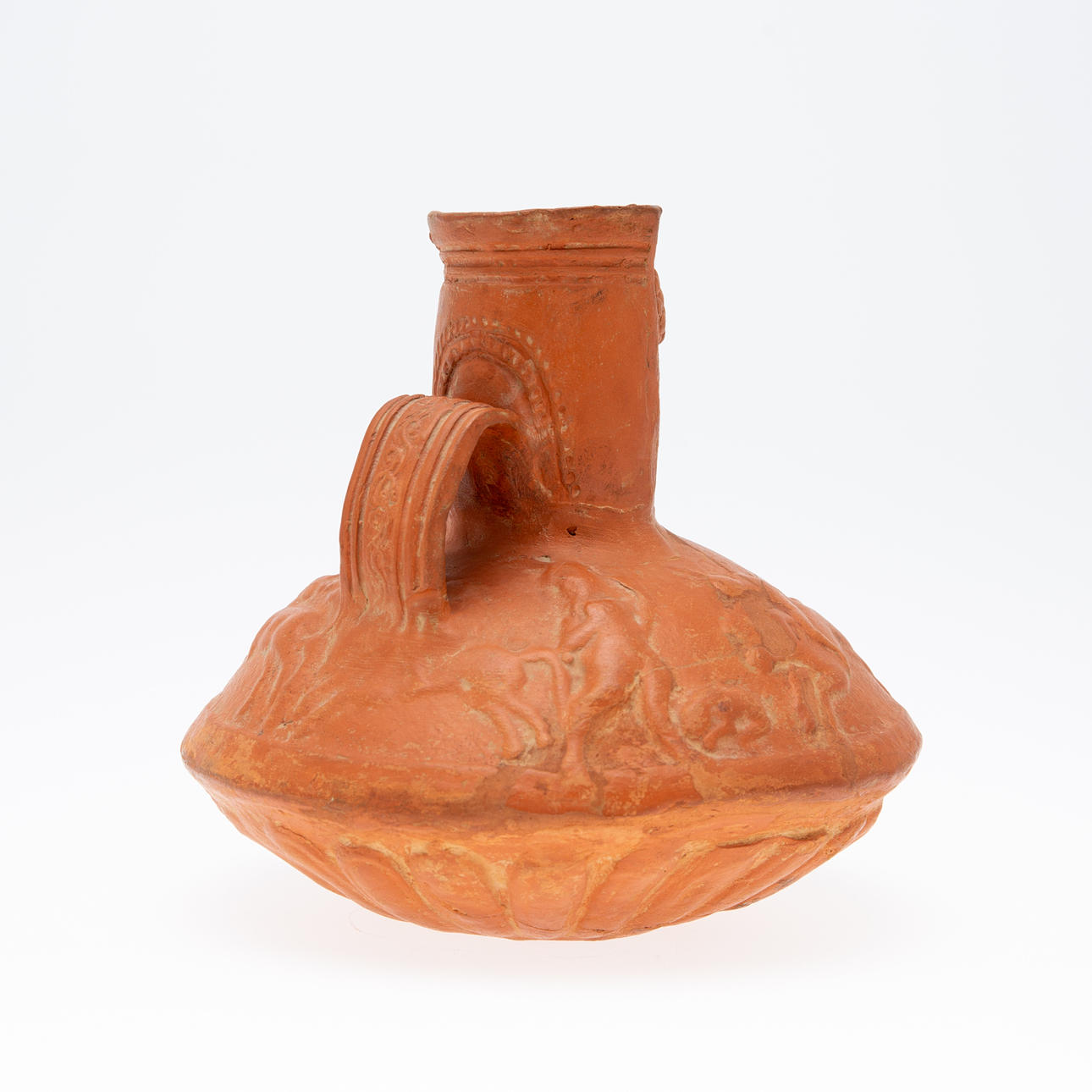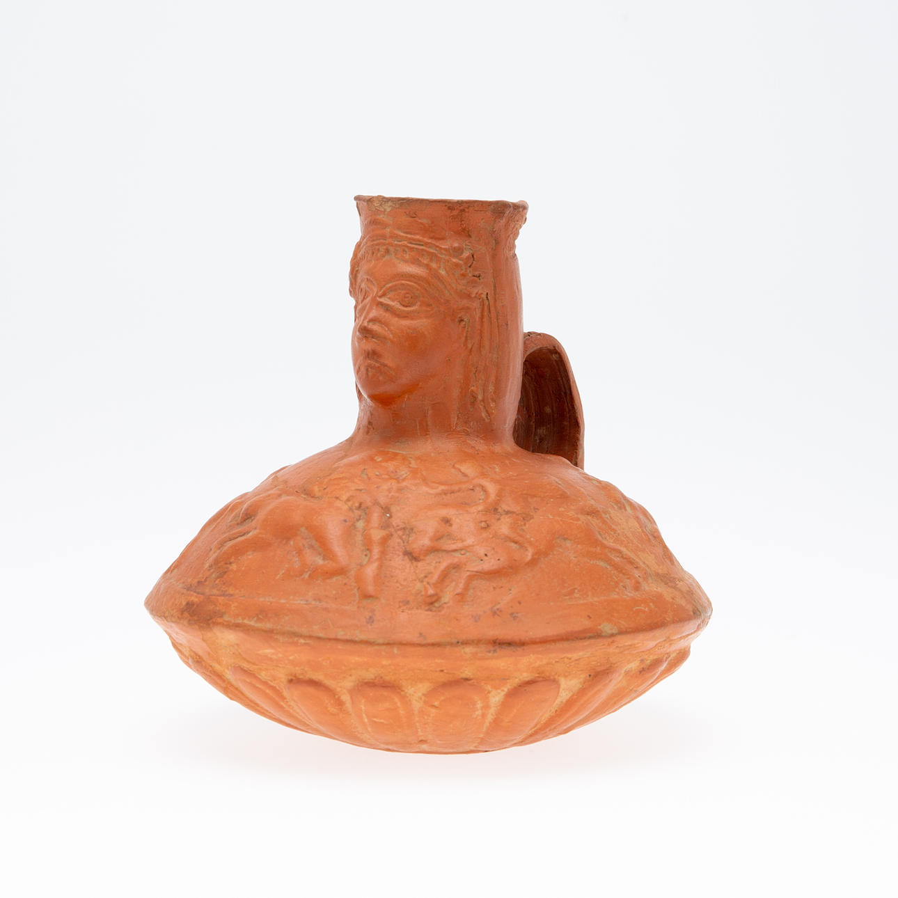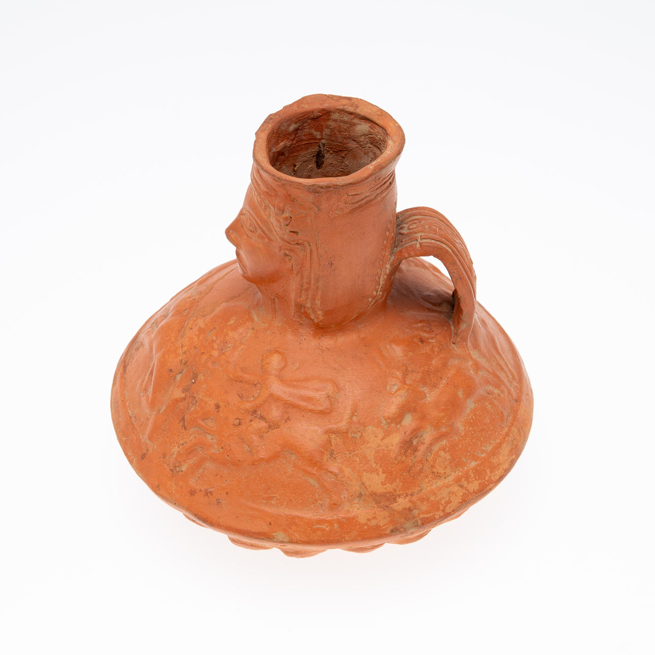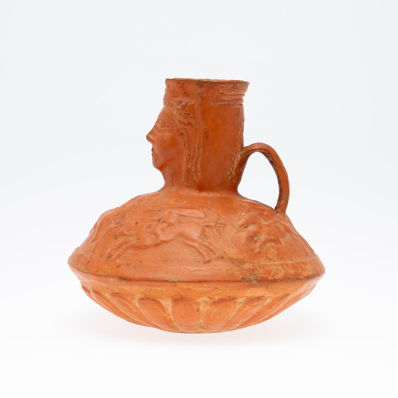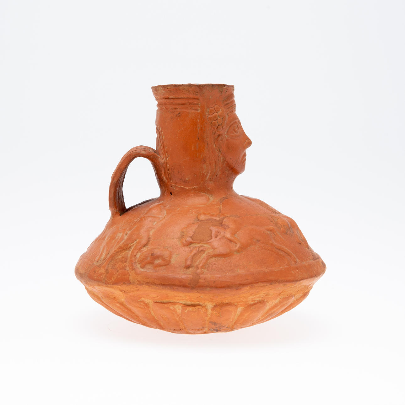 Vas/kärl, lera, Nordafrika. Lerkärl med sidohandtag och reliefskildring av ett ansikte på fartygets hals, dekorerad med jaktscener i relief på kroppen, H.16cm, D.18cm.