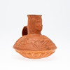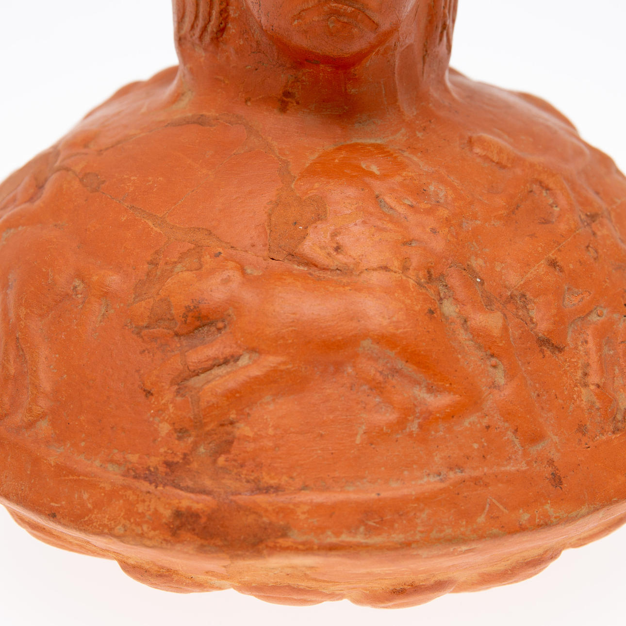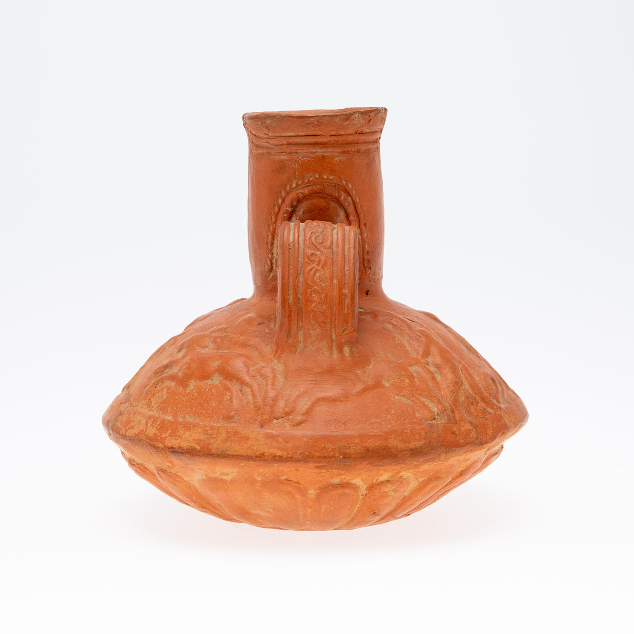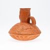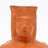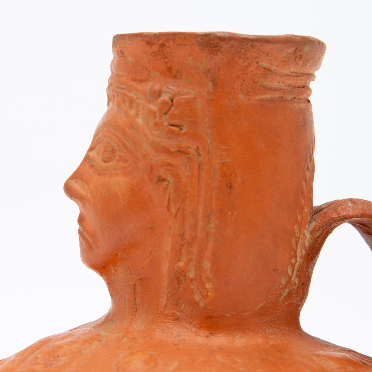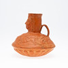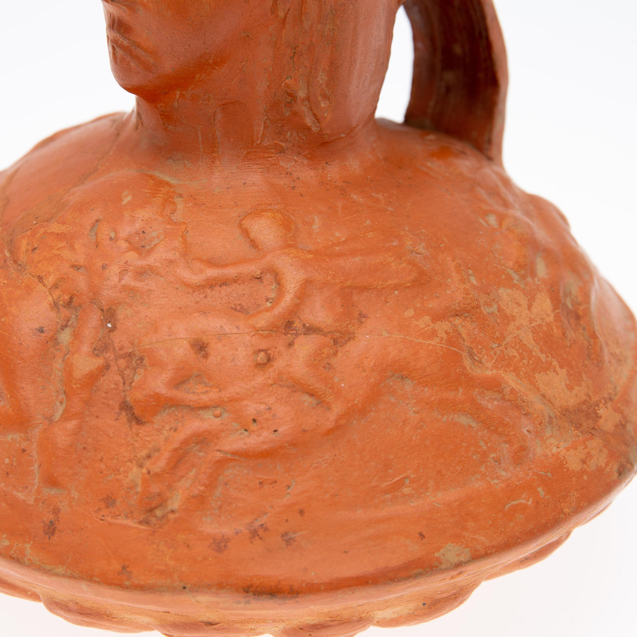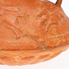 Vas/kärl, lera, Nordafrika. Lerkärl med sidohandtag och reliefskildring av ett ansikte på fartygets hals, dekorerad med jaktscener i relief på kroppen, H.16cm, D.18cm.