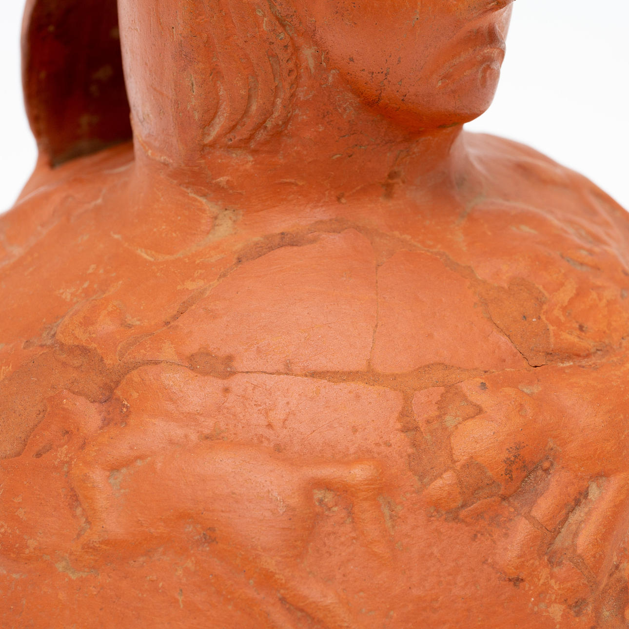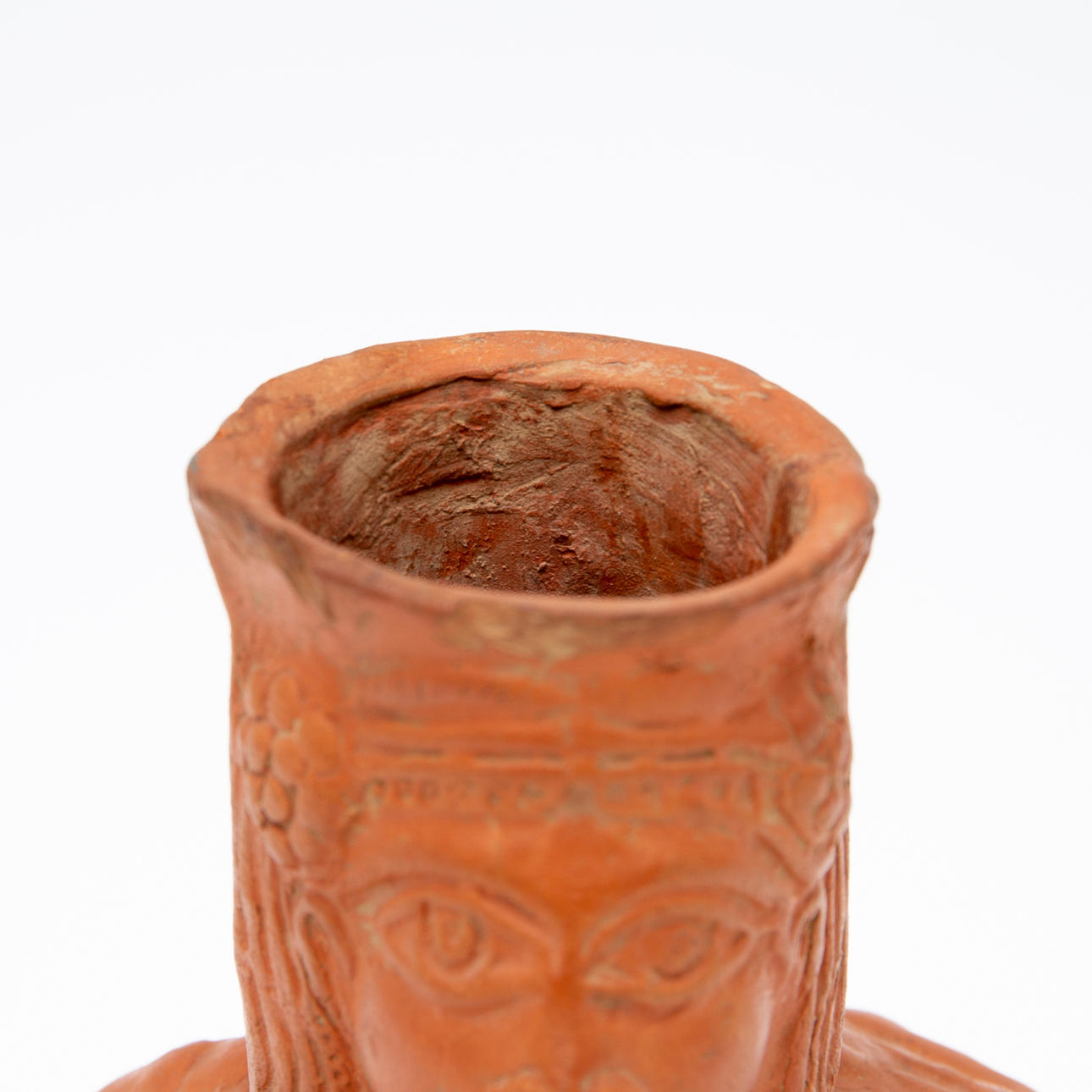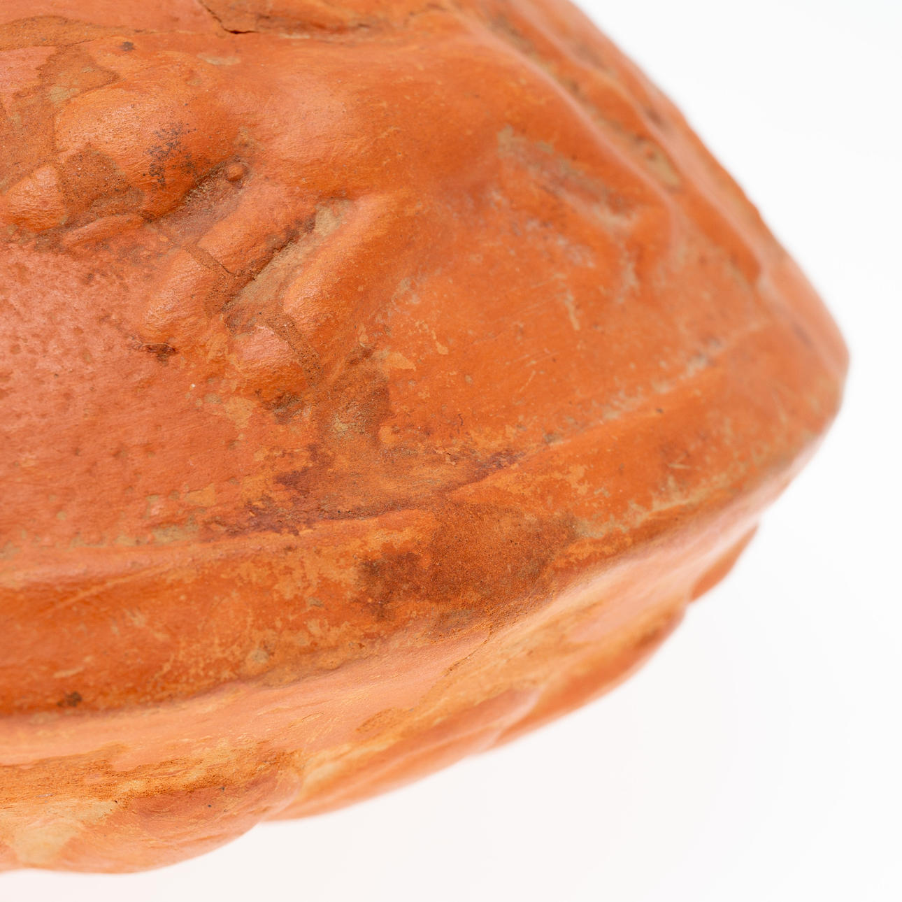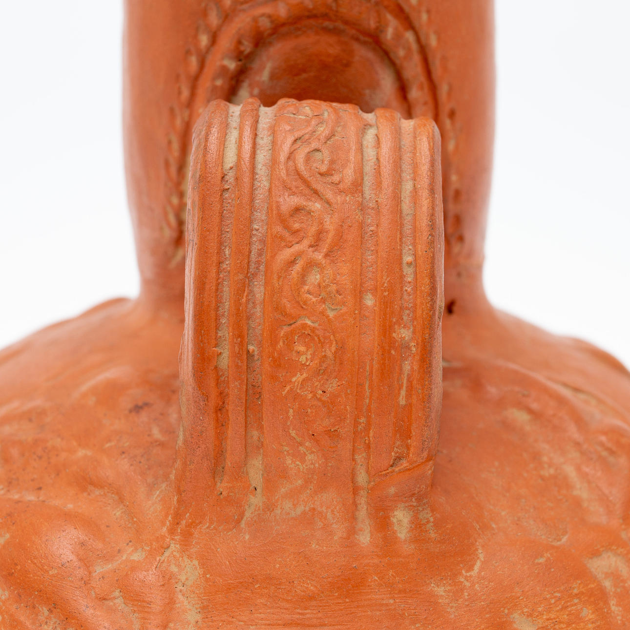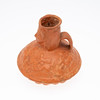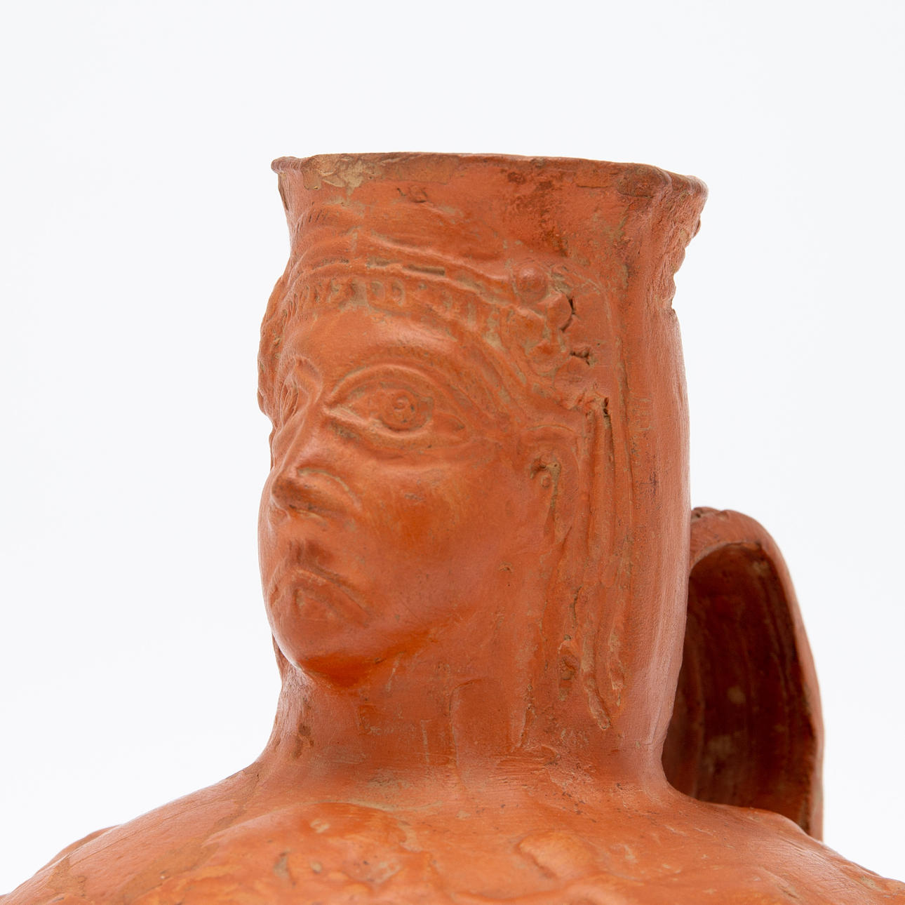 Vas/kärl, lera, Nordafrika. Lerkärl med sidohandtag och reliefskildring av ett ansikte på fartygets hals, dekorerad med jaktscener i relief på kroppen, H.16cm, D.18cm.