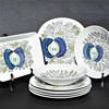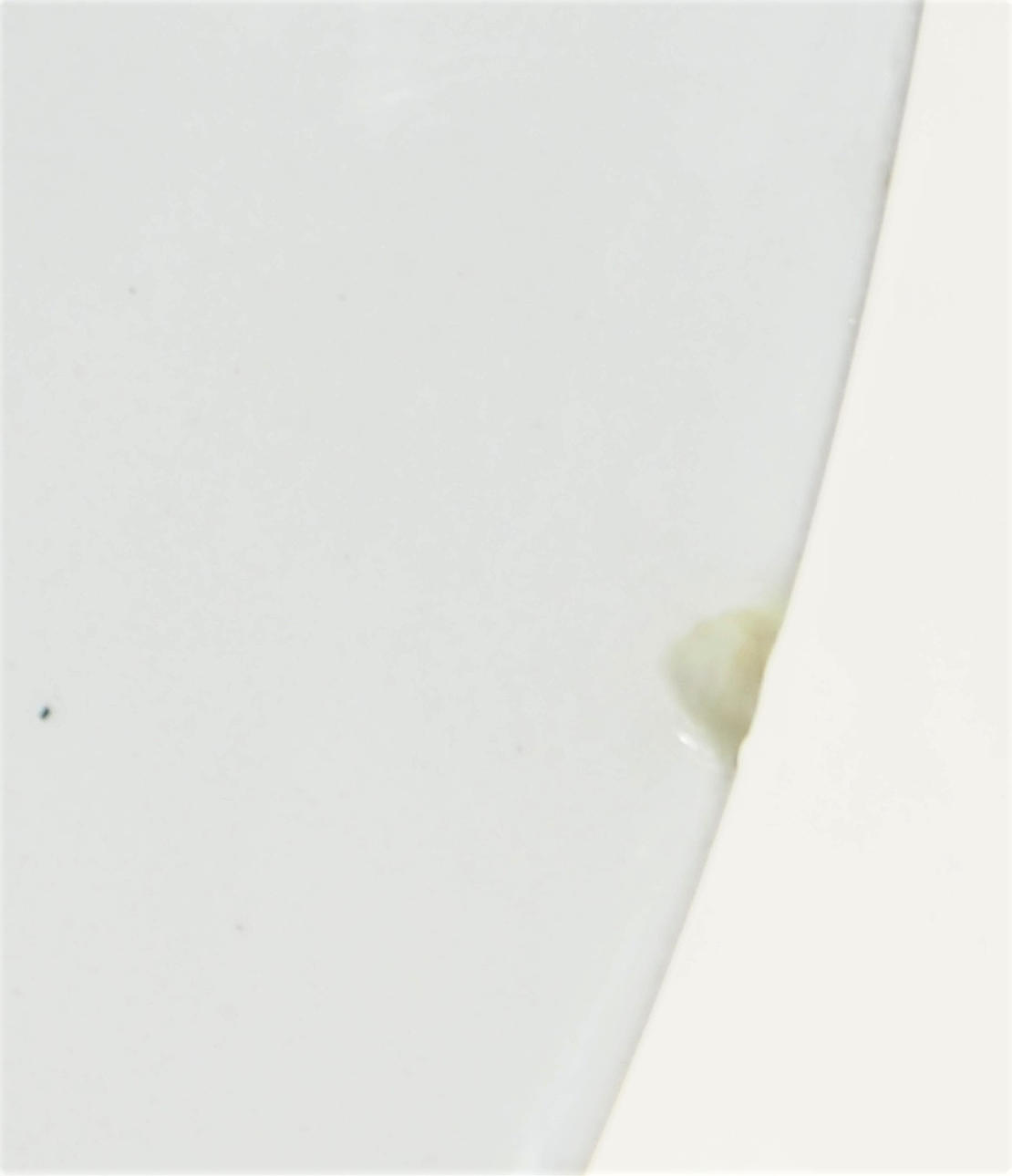 En tallrik med avslag under kant, och två med mindre kantskav. I övrigt syns lite bestickrepor främst på tallrikar.