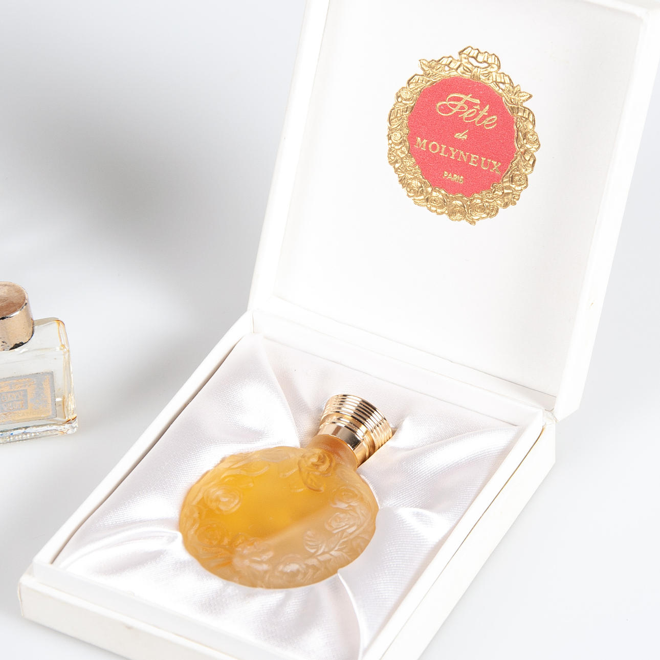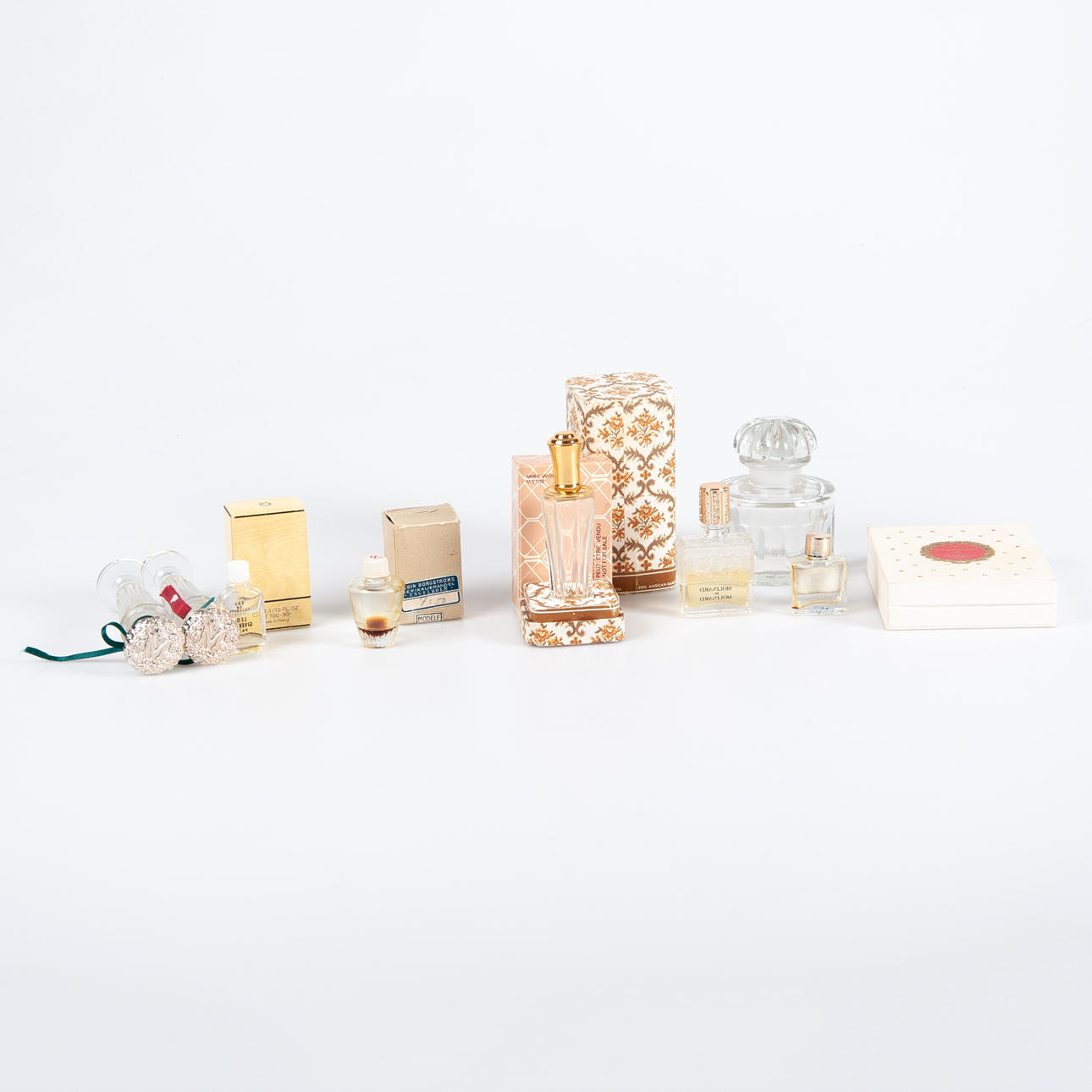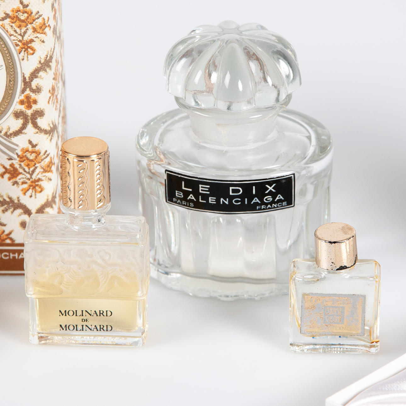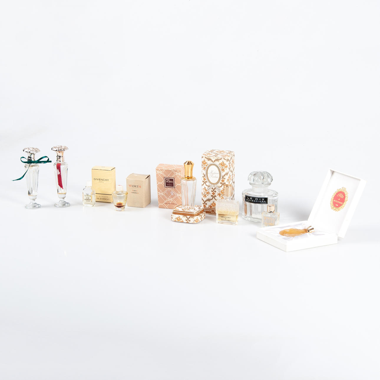 Samling parfym- och Eau de Cologne flaskor från franska parfymhus. Bl a Givenchy, Worth, Molinard, Molyneux, Rochas. 1960 -70-tal.