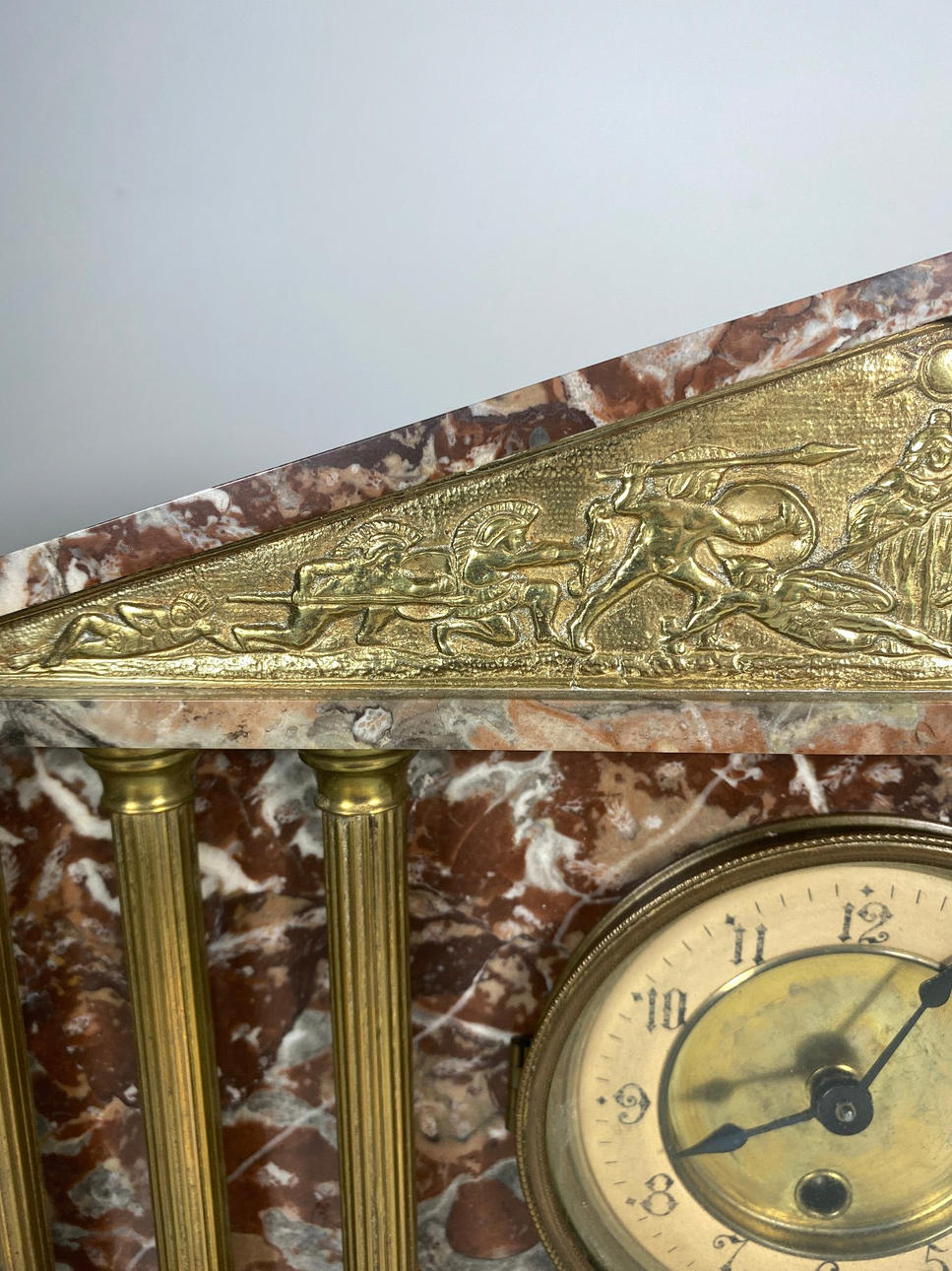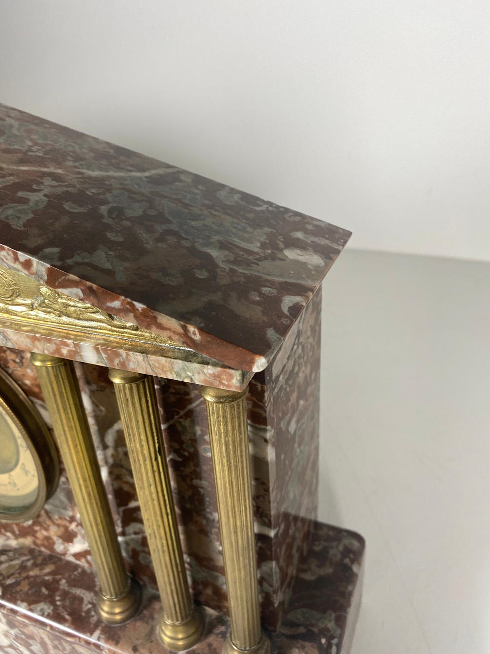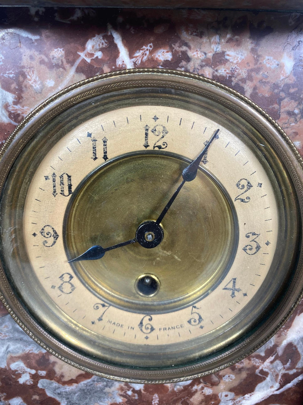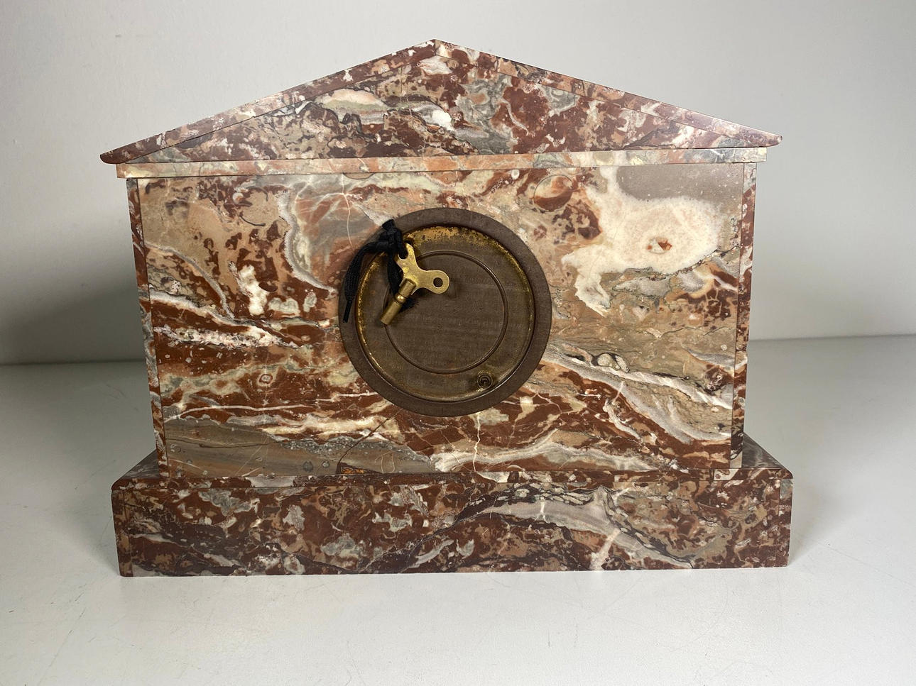 Fransk bordsklocka/öppen spis klocka, brun marmor med mässing, Mått: h. 30 cm. B. 40 cm T: 11,5 cm.