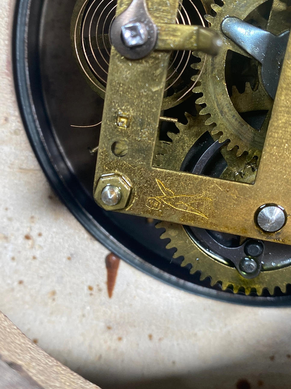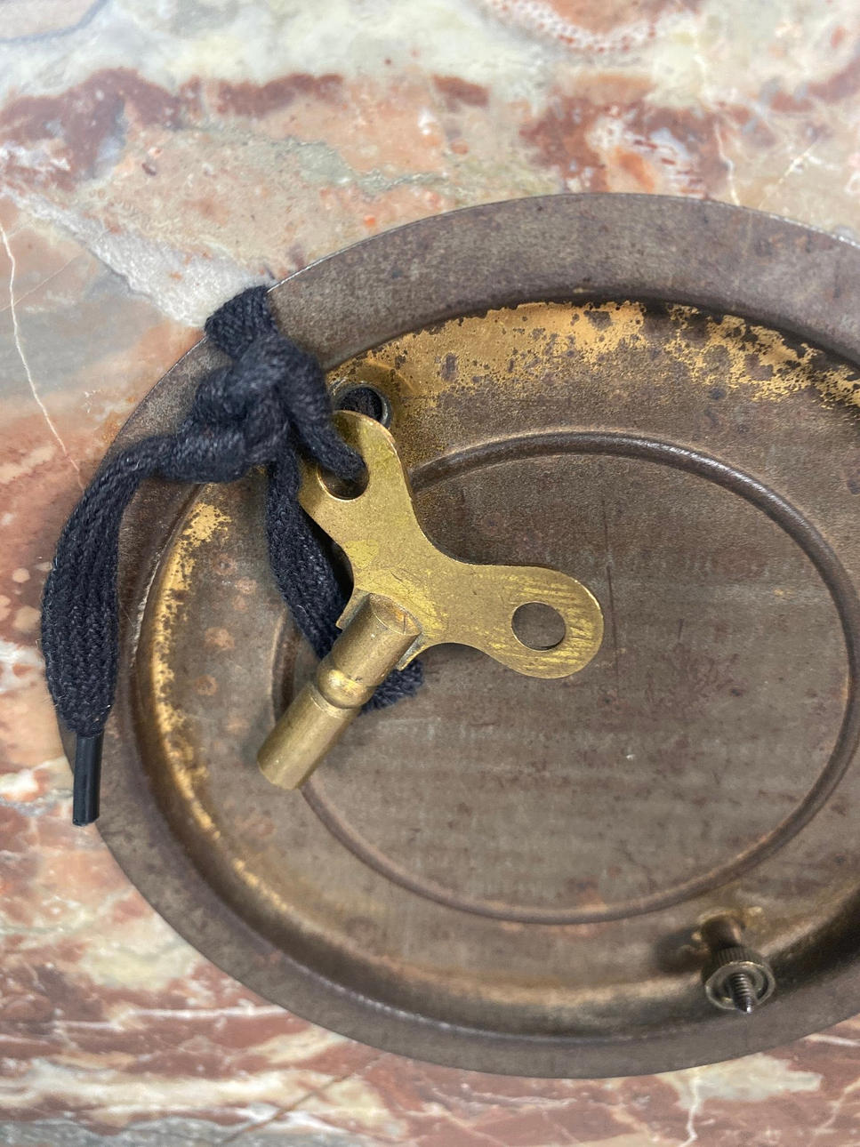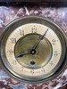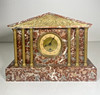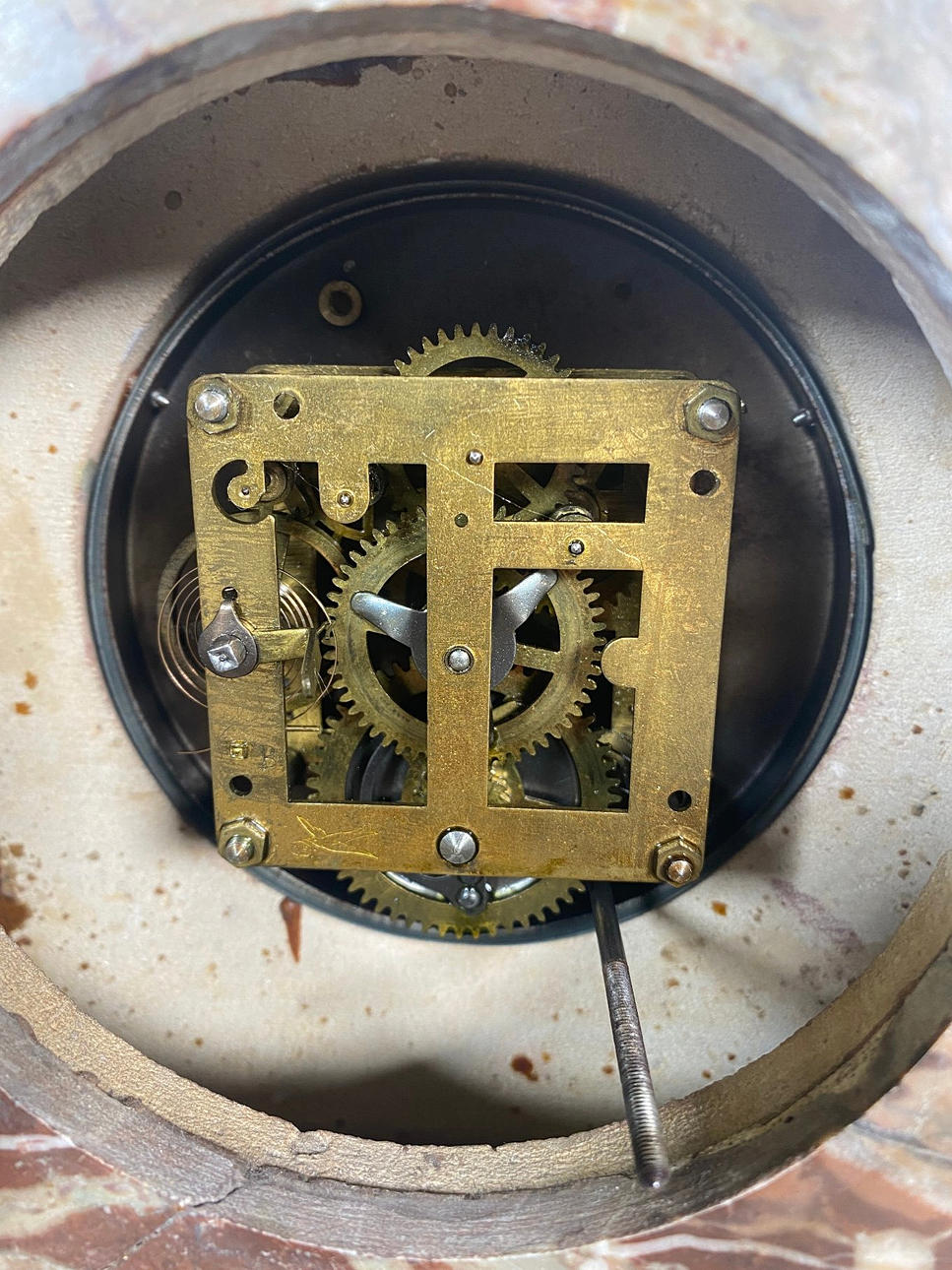 Fransk bordsklocka/öppen spis klocka, brun marmor med mässing, Mått: h. 30 cm. B. 40 cm T: 11,5 cm.