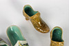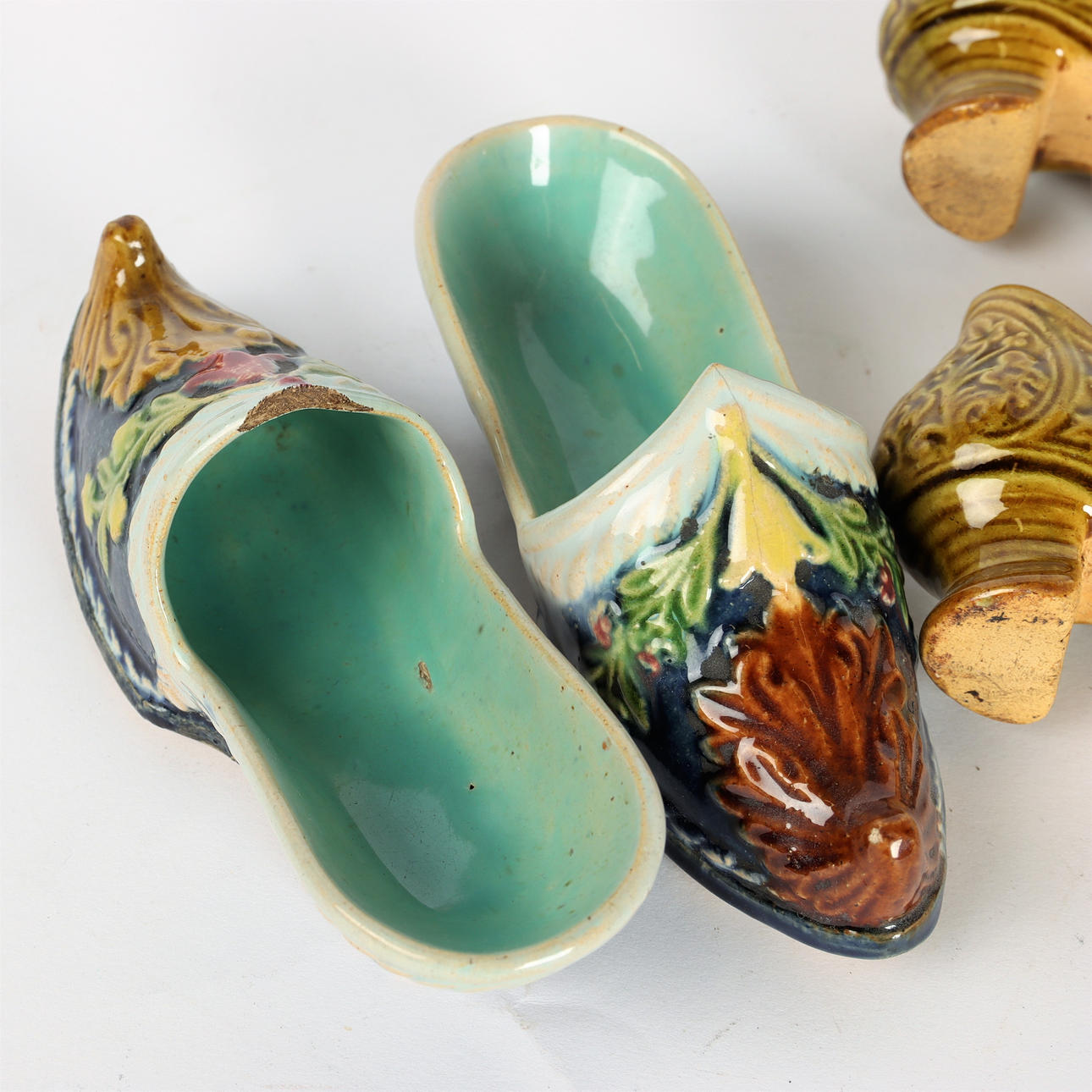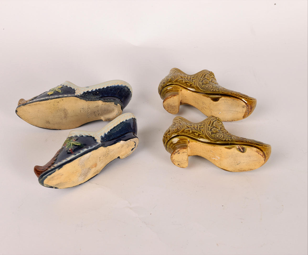 2 st par skor i miniatyr. Glaserad keramik, majolika. Höganäs Sverige 1800-tal. Stämplade. Ena paret signerat KS, K.R. Svensson, verksam hos Höganäsbolagen 1891-1946.