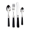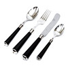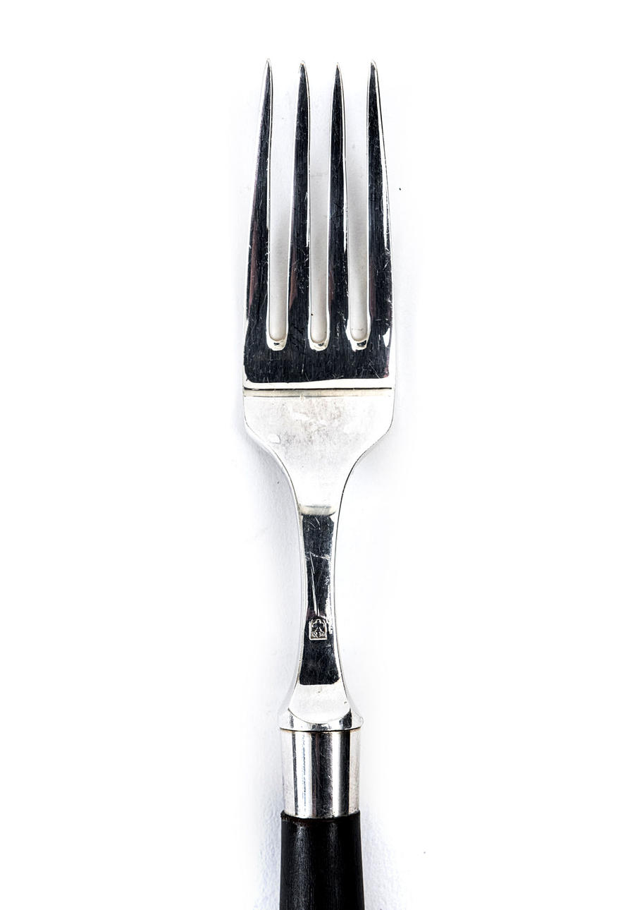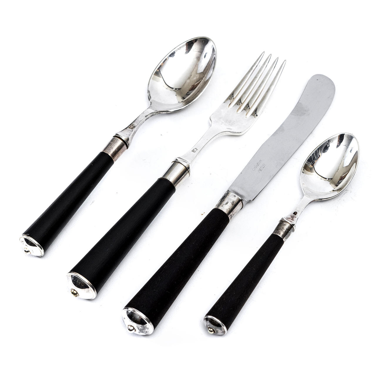 Nysilver, rostfritt stål samt svärtade skaft i träimitation. 12 bordsknivar, längd 20 cm. 12 gafflar, längd 19 cm. 12 teskedar, längd 14 cm. Dessertsked, längd 17 cm.
