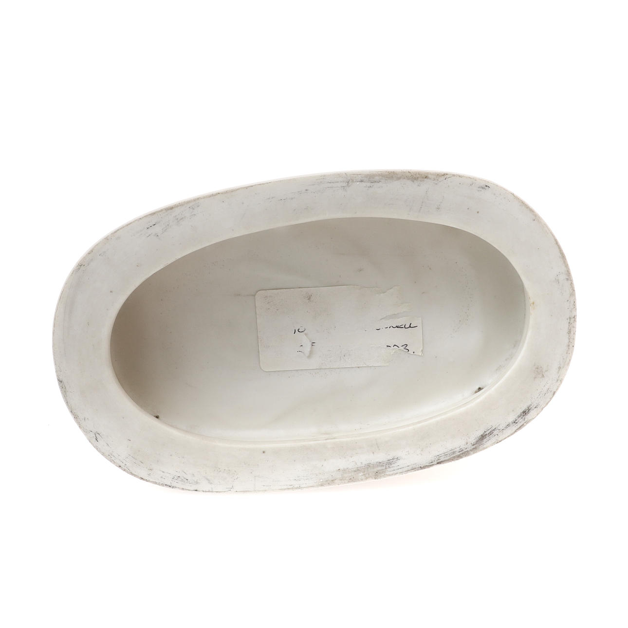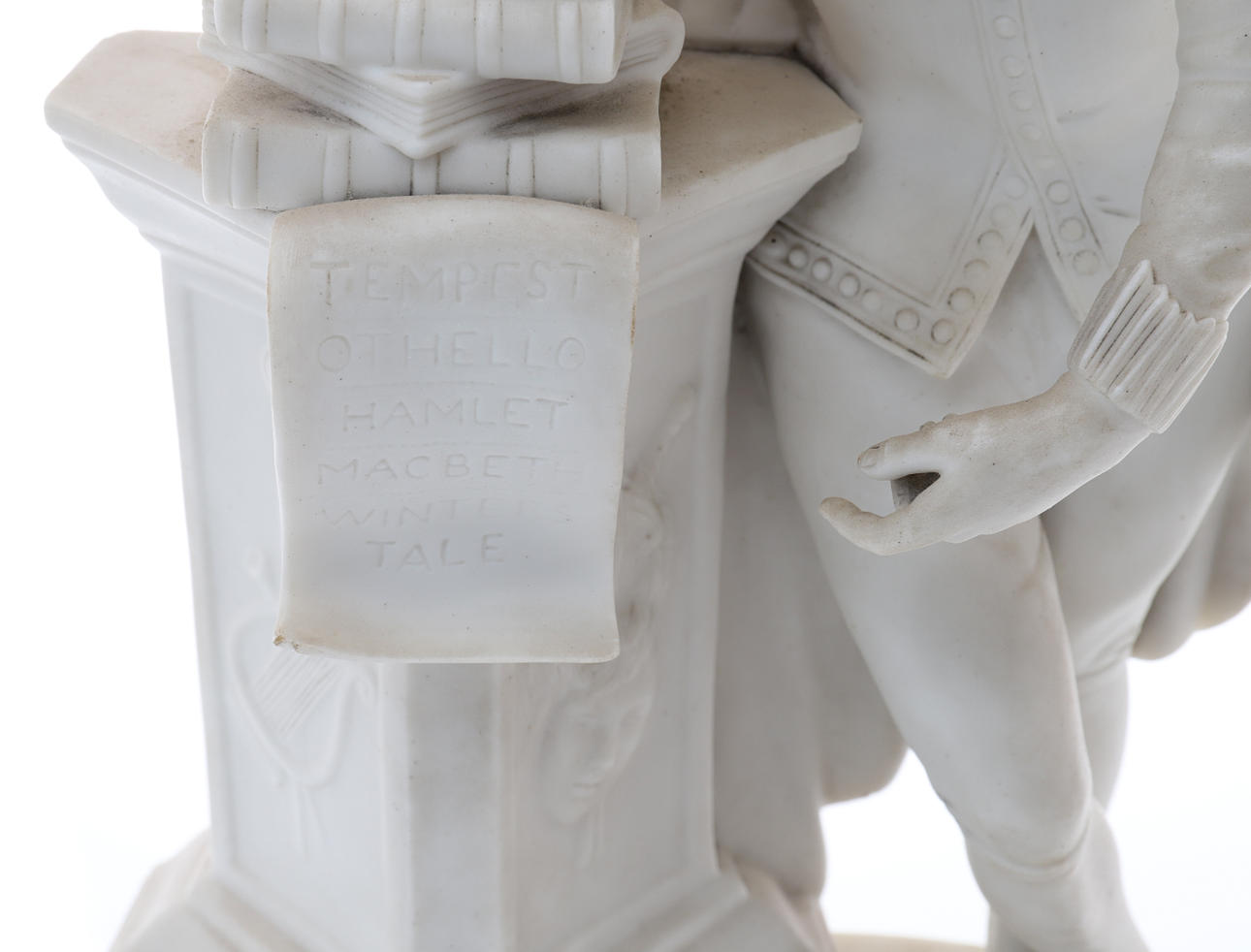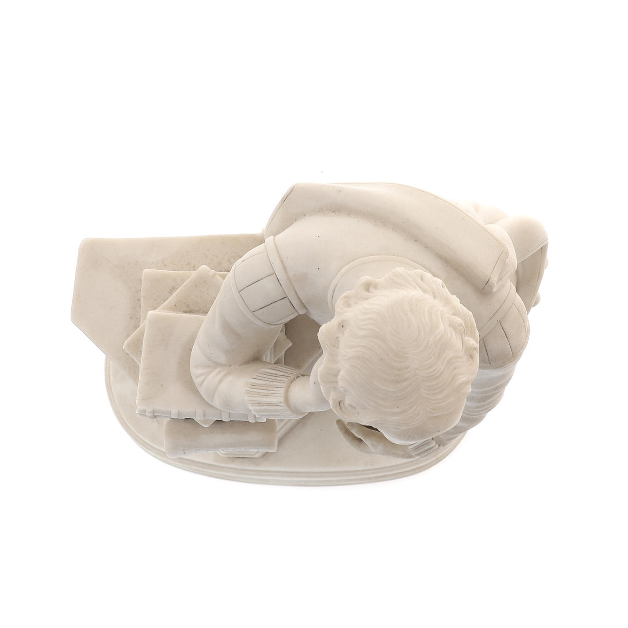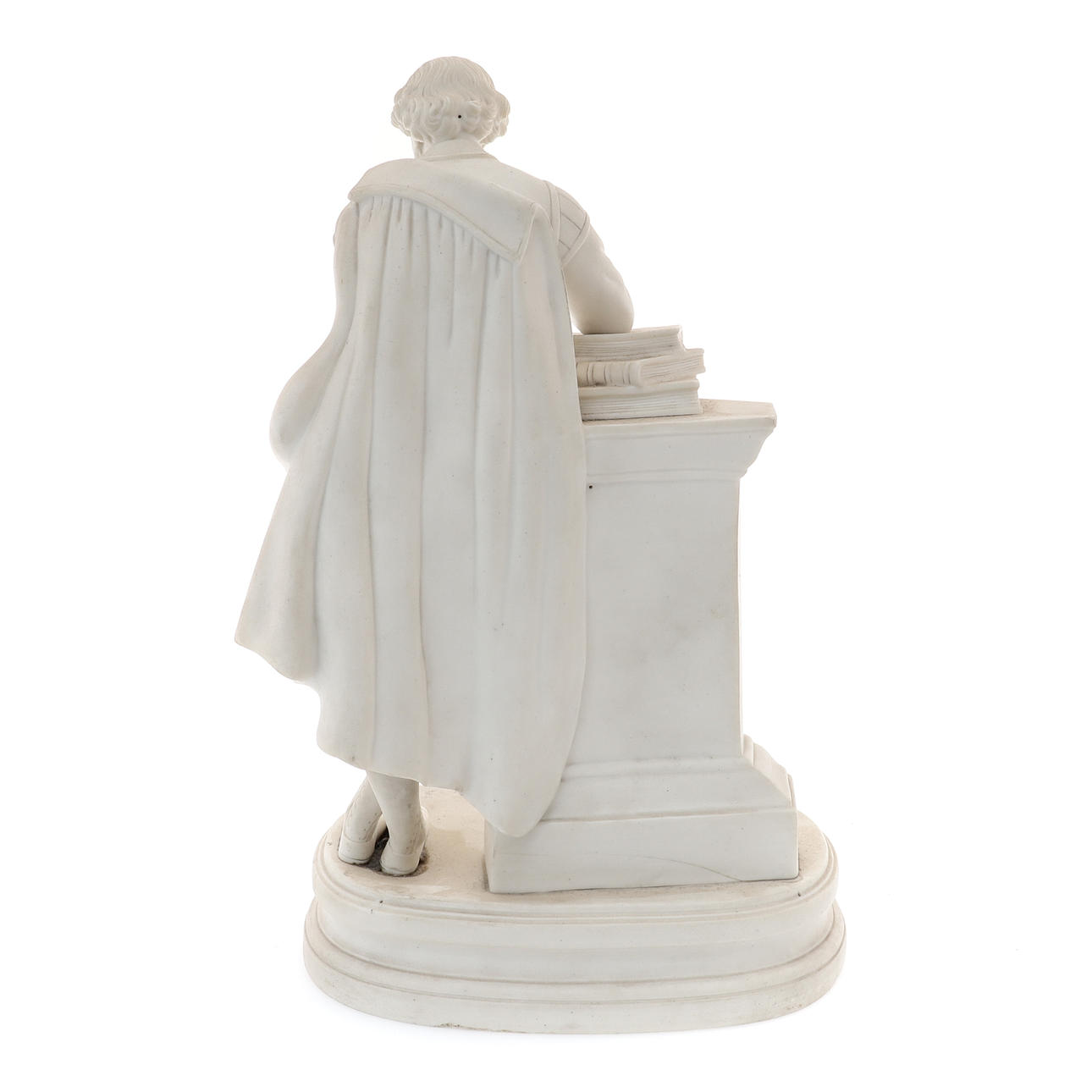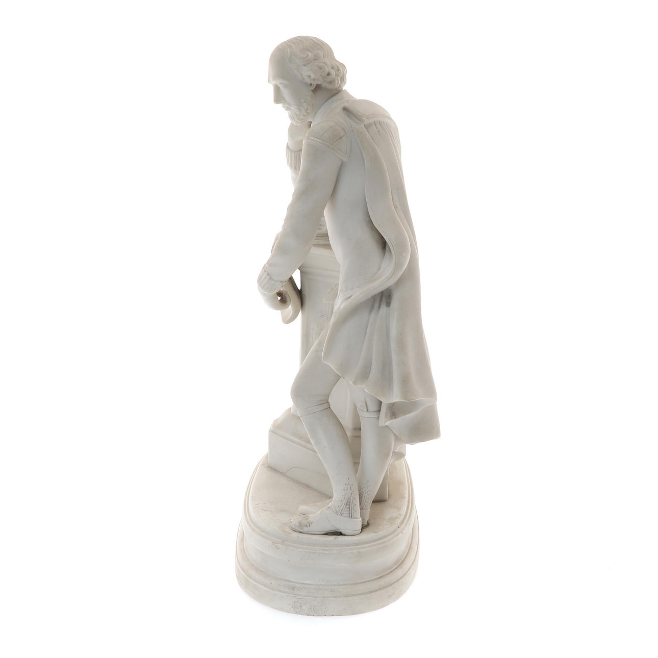 stående korsben, en arm vilande på tre böcker på toppen av en piedestal, en rullning som beskriver hans pjäser, oval sockelbas, 35,5 cm hög.