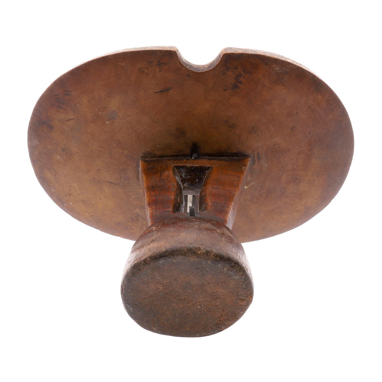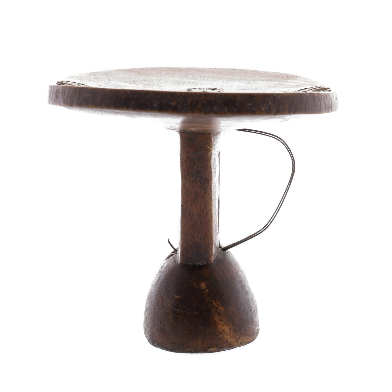 det formade huvudstödet med spikad dekoration, den genomborrade kolonnen med metallfäste, på en rundad spridningsbas, 23.2cm x 16cm x 15.5cm
