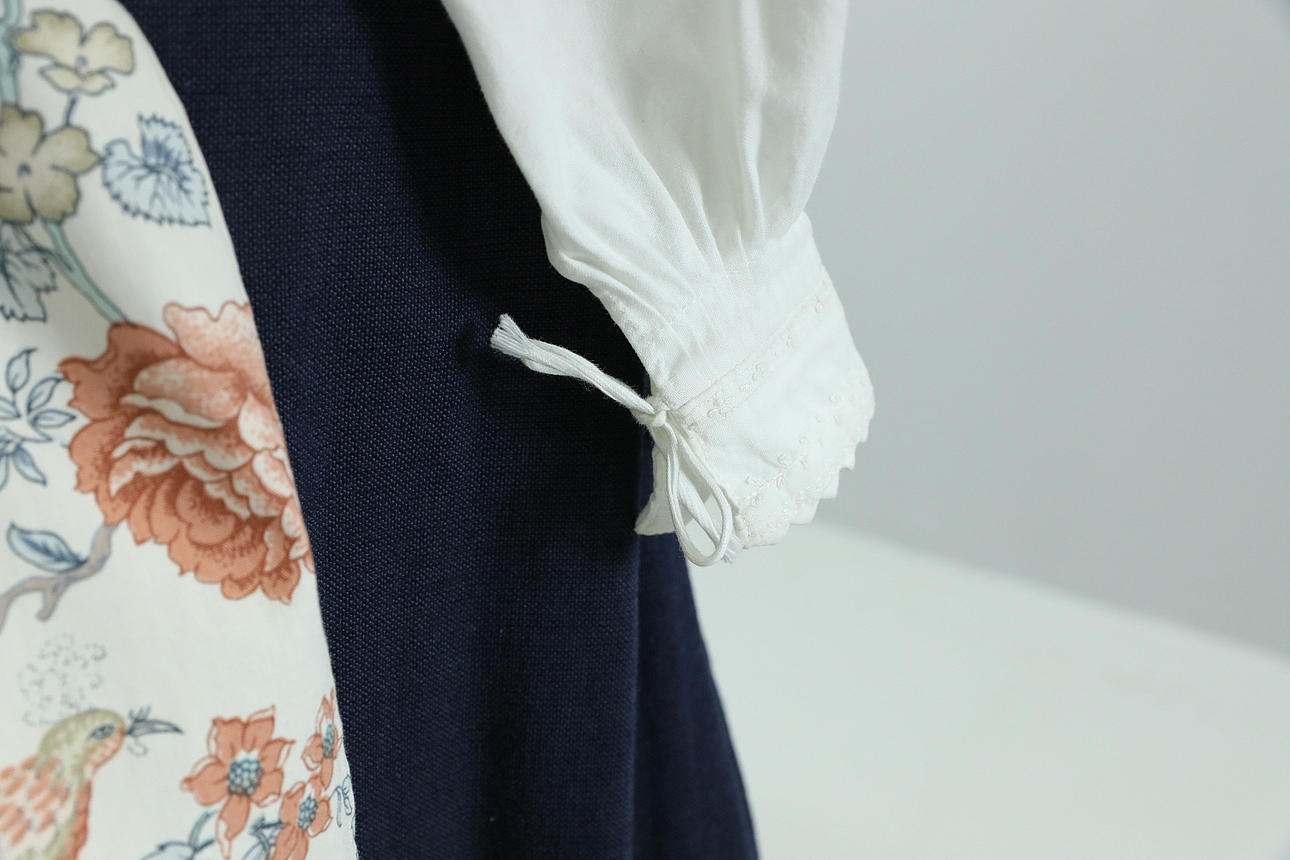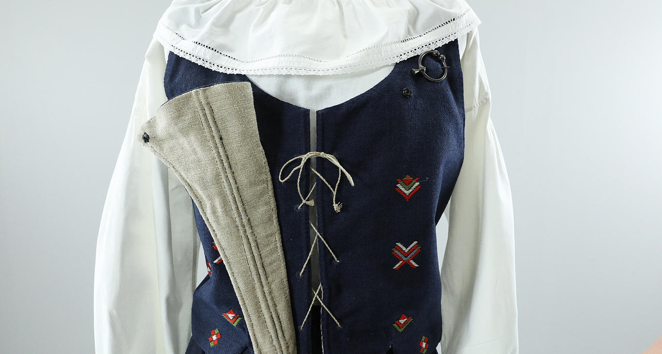 LIVSTYCKE, mörkblått ylle med krabbasnår-möster, snörning, helfodrat med oblekt linne. Överciddsmått 90 cm, midjemått 82 cm, längd från axel 46 cm