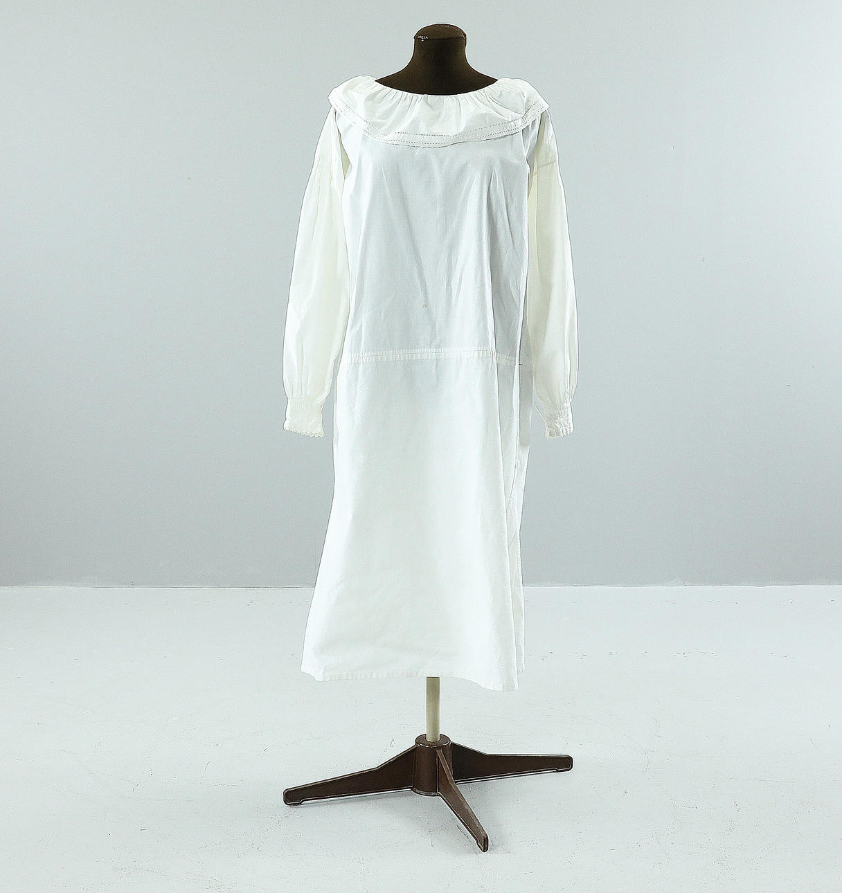 BLUS/SÄRK, vit bomull, rundskuren krage med lagda veck, kantad med knypplad spets. Överviddsmått mätt under ärmhål 116 cm, längd från axel 108 cm, ärmlängd från halsringning 69 cm.