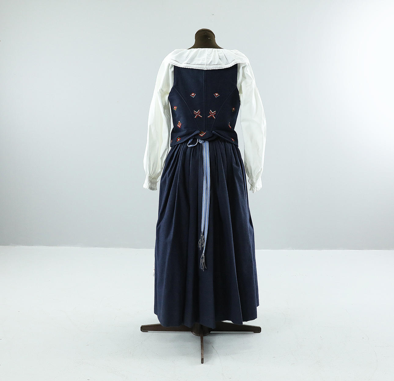 LIVKJOL, mörkblått ylle, linning kantad med oblekt linne. Midjemått 68 cm, Längd 85 cm, plus 15 cm i fåll.