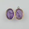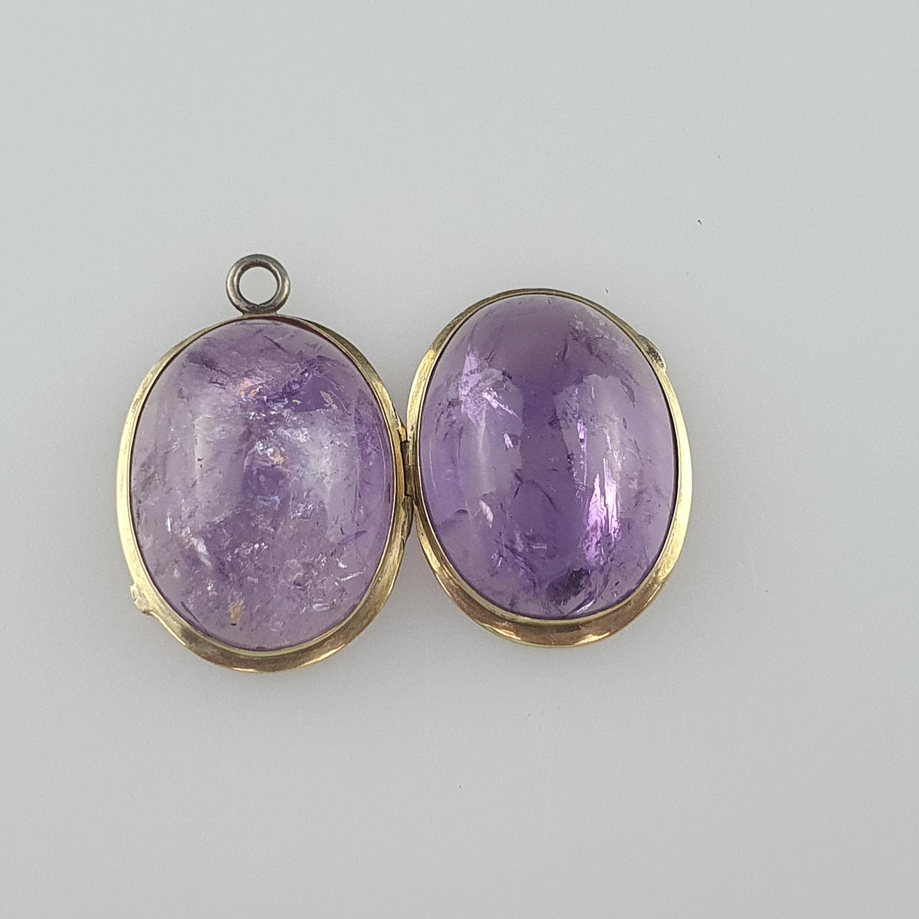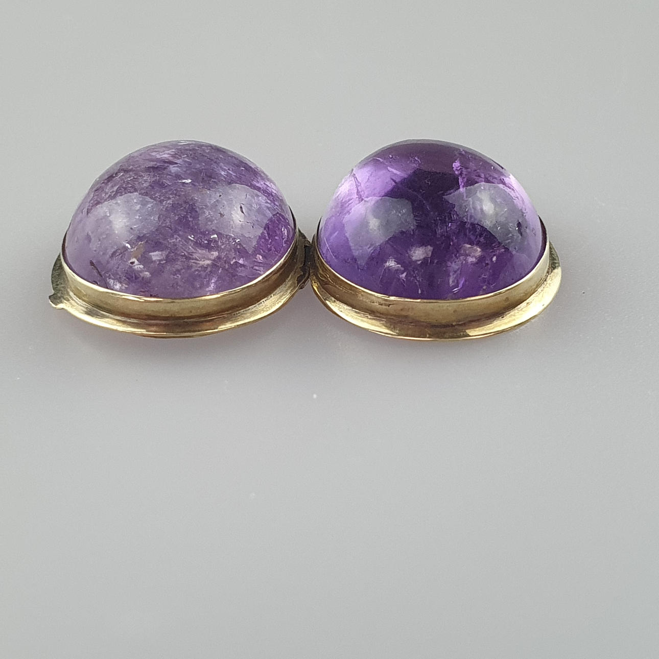 mycket oval form, gångjärn, båda sidor vardera dekorerade med en ametist cabochon, guldpläterade inställning, L.(utan ögla) x B: ca. 2,6x2 cm.