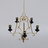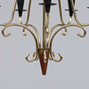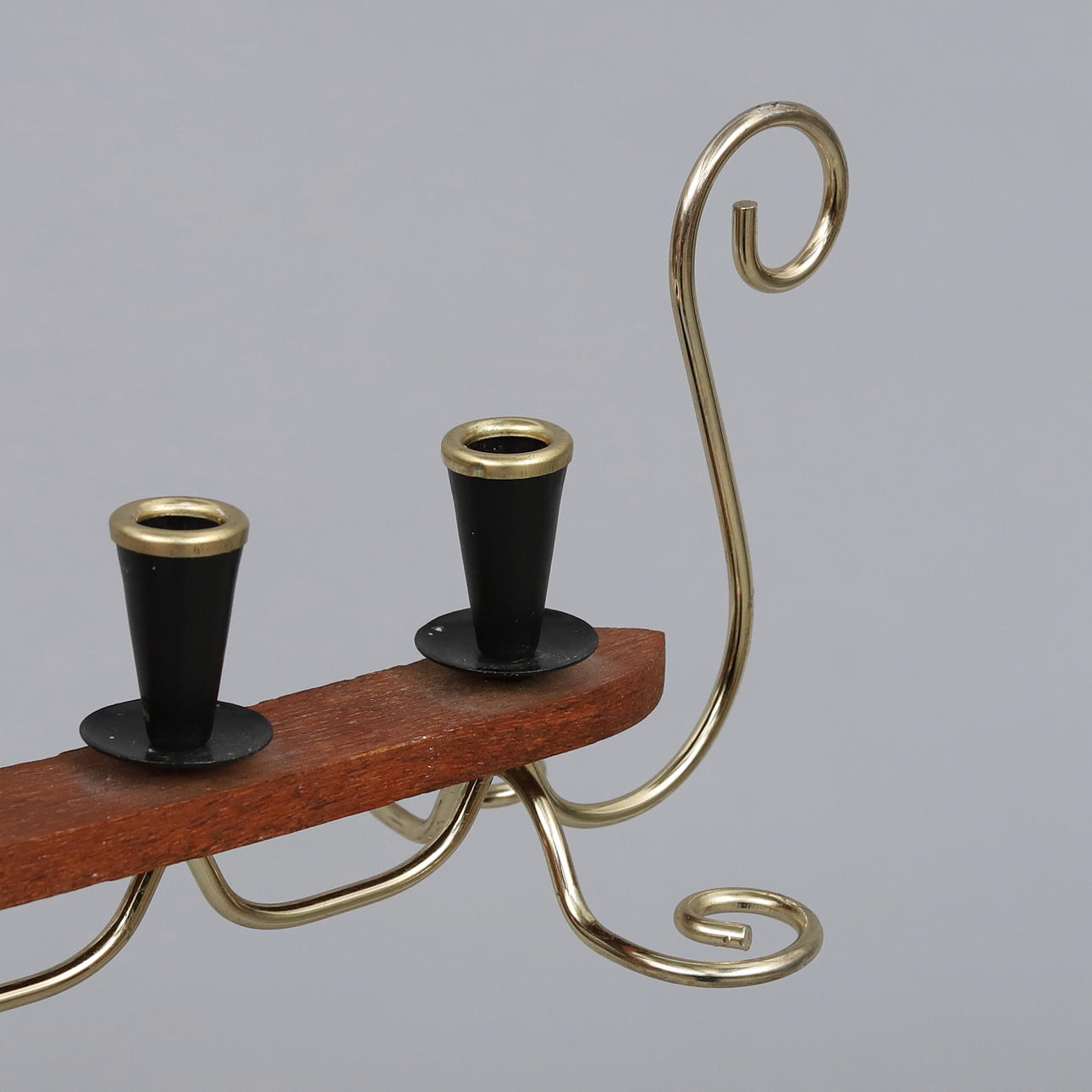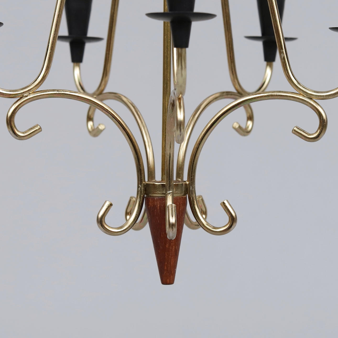 Adventsljusstake samt mindre femarmad krona i mässing, teak och lackerad metall. Formgivna av Gunnar ander för Ystad Metall.