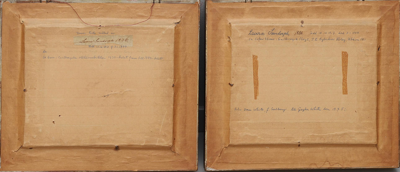 Enligt etiketter a tergo utförda av Laura Sundorph (1808-1884) år 1836, olja på pannå, dagmått ca 21x27 cm, samtida förgyllda ramar.