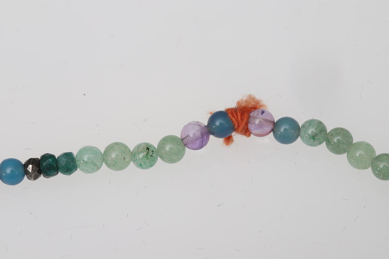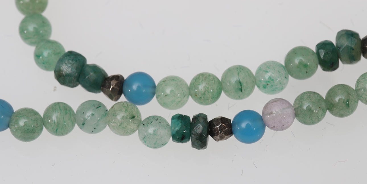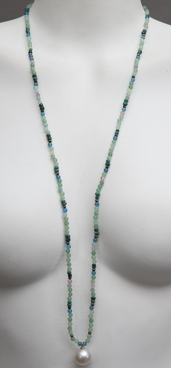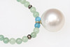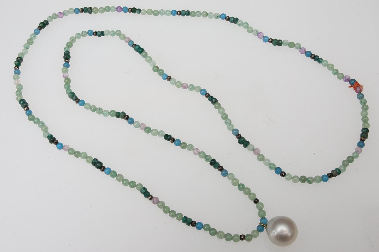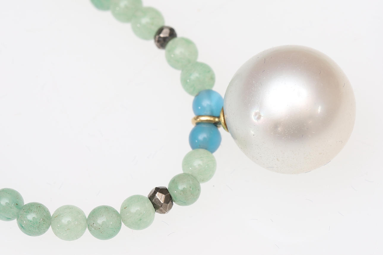 South sea-pärla med 14k guld-fäste, ca 16 mm i diameter. Rundslipade blå topas, ametist, grön agat, pyrit (svavelkis) och smaragd, diameter på kulor ca 4-5 mm.
