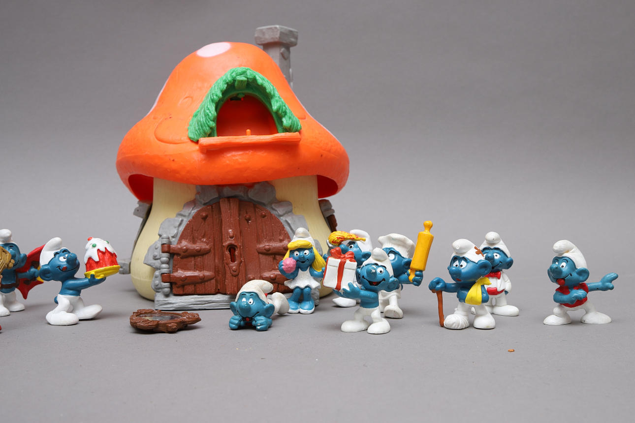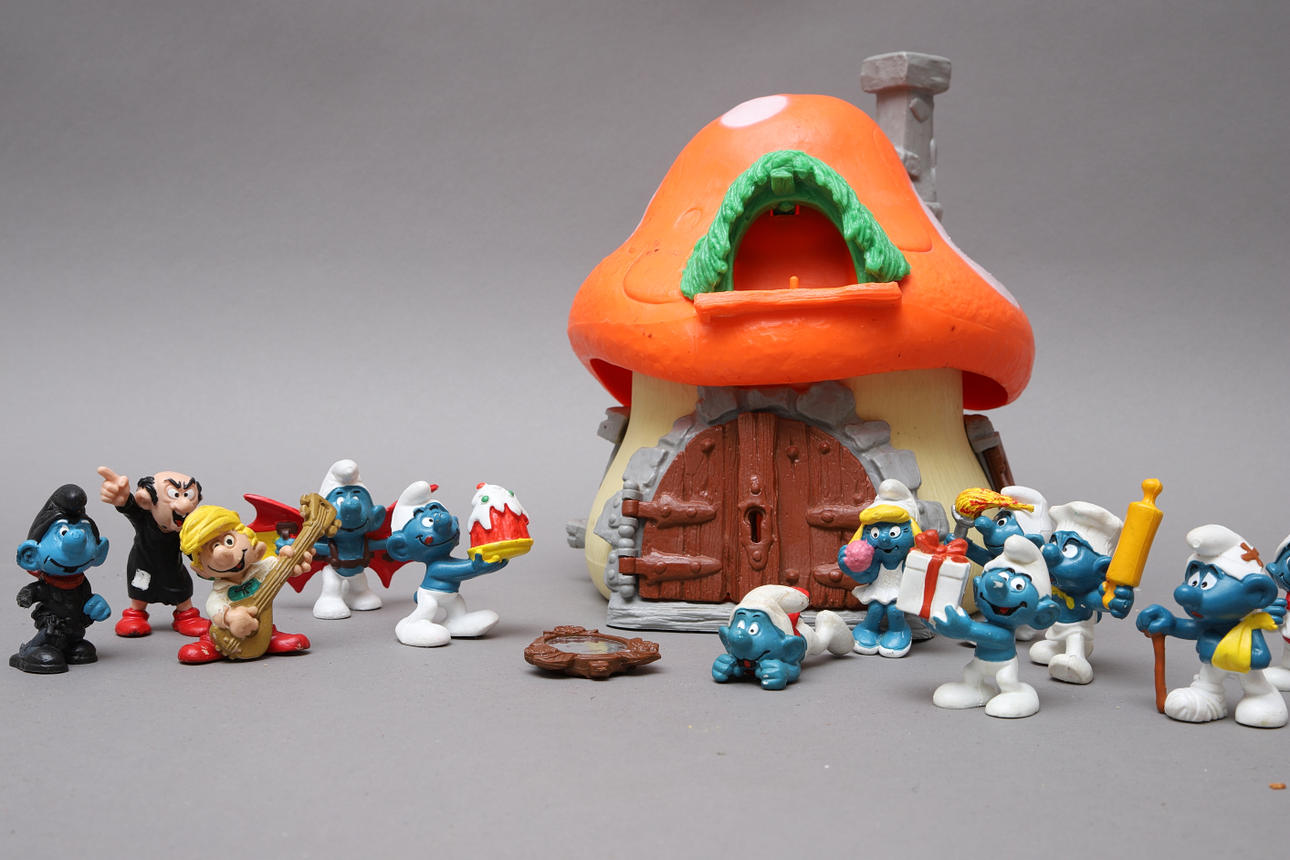 Hus med avtagbar dörr samt tak & fönster. Höjd på hus ca 22 cm. Höjd på figurer, mestadels smurfar, ca 6 cm.