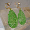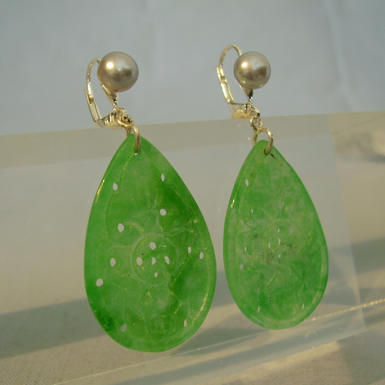 Öronkrokarna är översållade med äkta, silvergrå odlade pärlor, med gröna jadedroppar snidade med buddhistiska symboler.