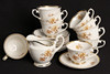bestående av 9 koppar, 12 fat, 1 gräddkanna, 1 kaffekanna med lock, 1 sockerskål med lock, 1 sockerskål utan lock (saknas), 12 assietter (d.16 cm), 1 uppläggningsfat (d.25).