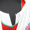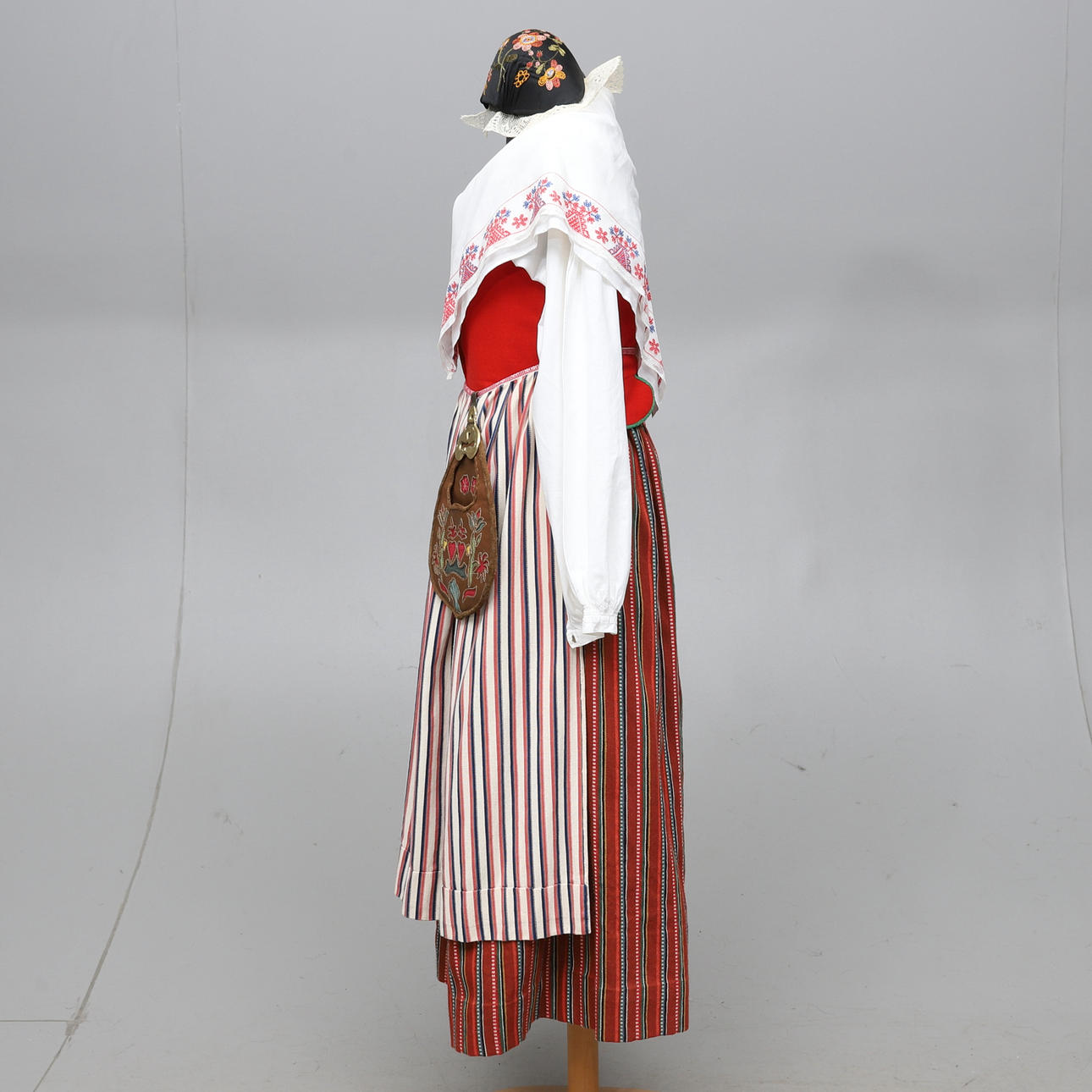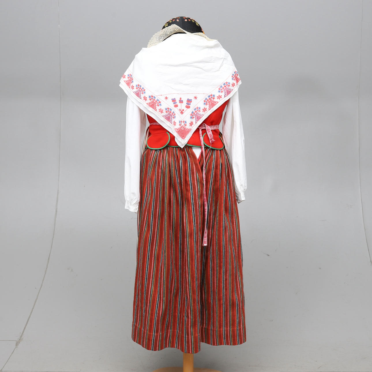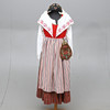 Kjol, förkläde, blus, väst, sjal, hätta och väska. Västens mått armhåla till armhåla ca 48 cm.