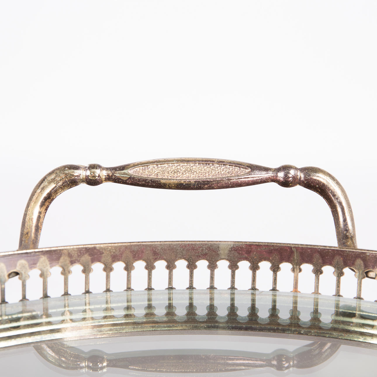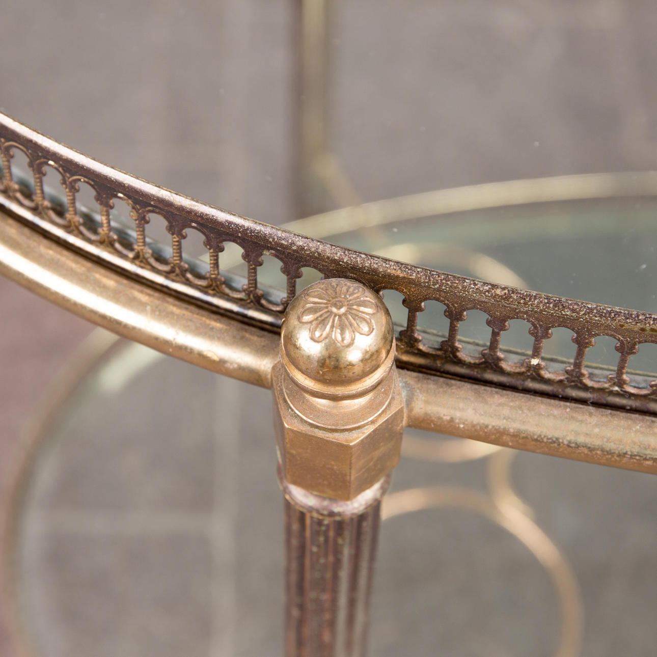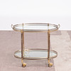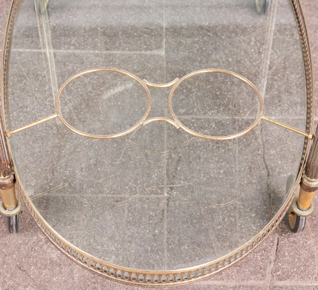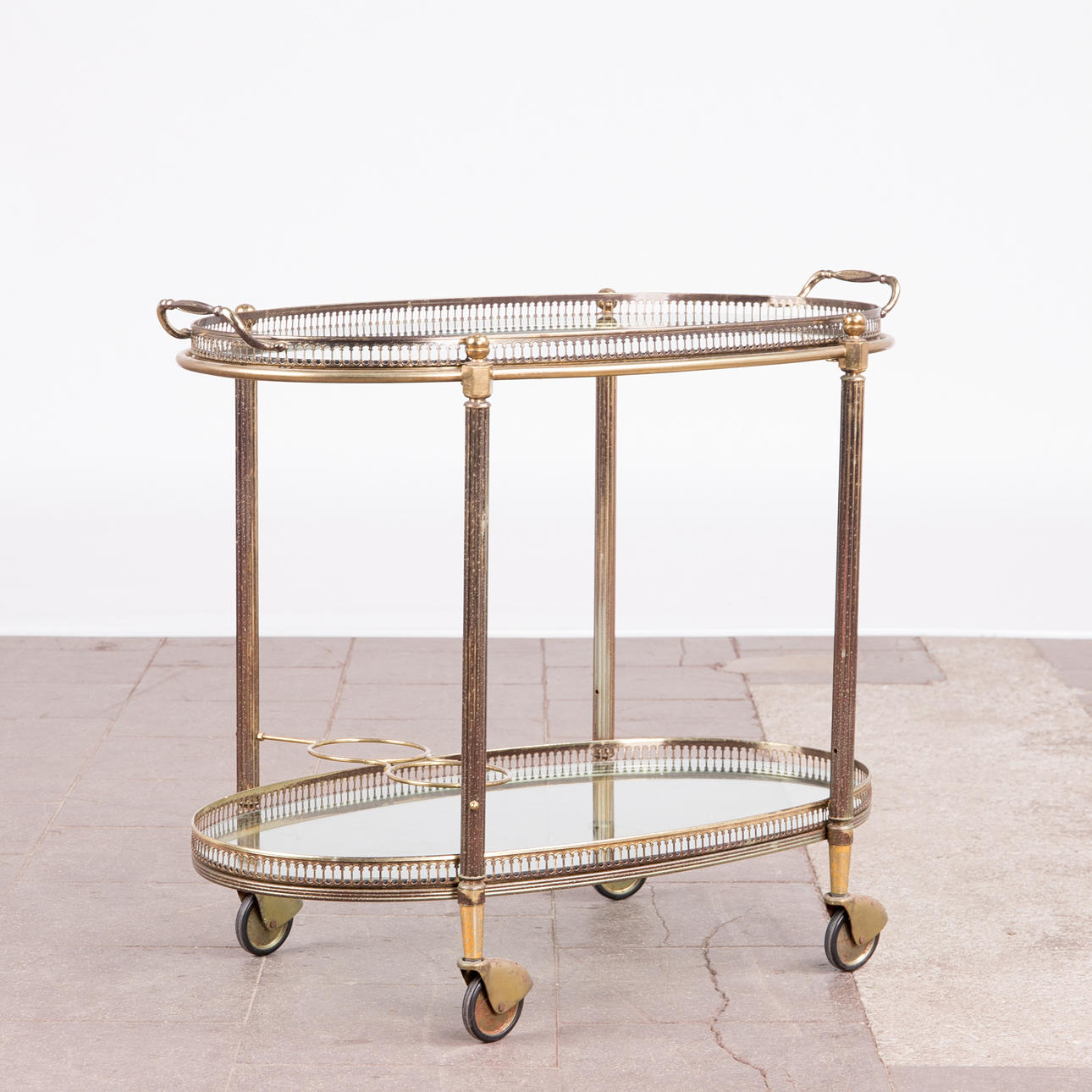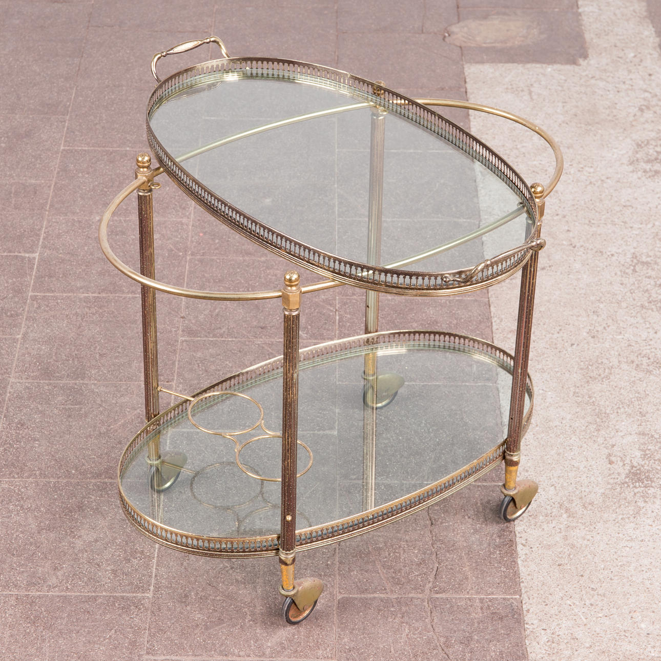 Barvagn/serveringsvagn, mässing, glas. Mässingskonstruktion med två ovala nivåer av tonat glas, övre nivå fungerar löst som en bricka, försedd med en dekorerad mässingsfälg och två handtag på sidan, utrustad med en hållare för två flaskor längst ner, H.59cm, L.70cm, W.40cm.