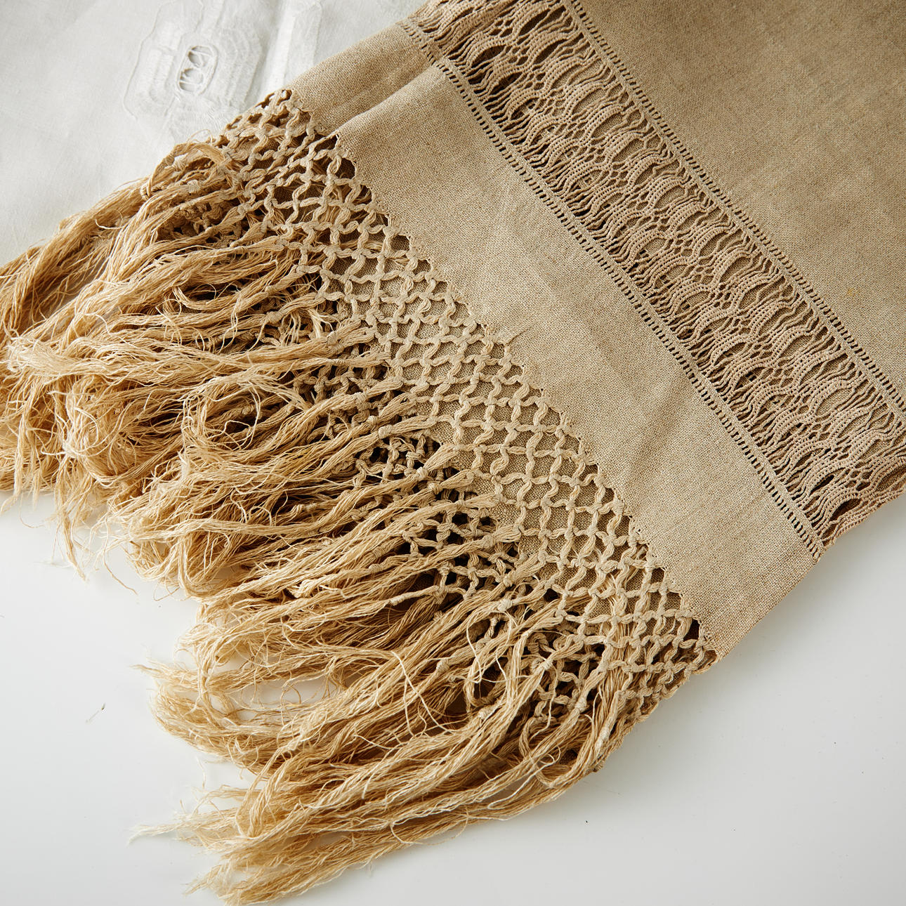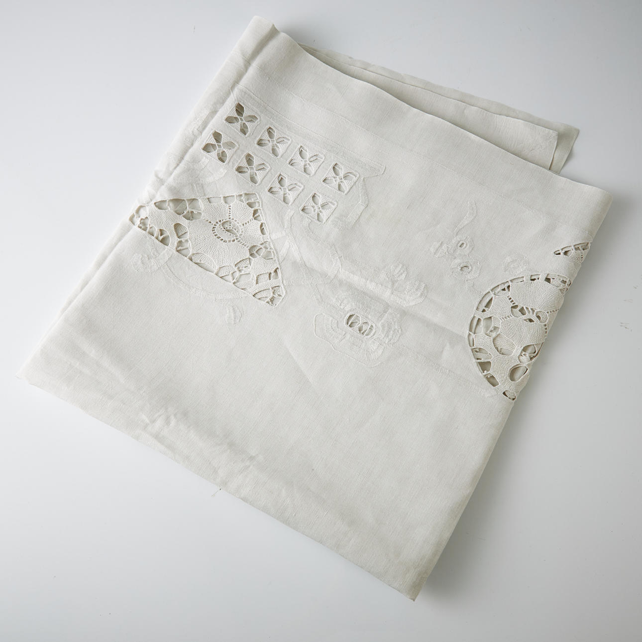 En duk med knutna fransar, den andra duken med hål- och plattsöm, ca 160x160 cm respektive 164x95 cm.