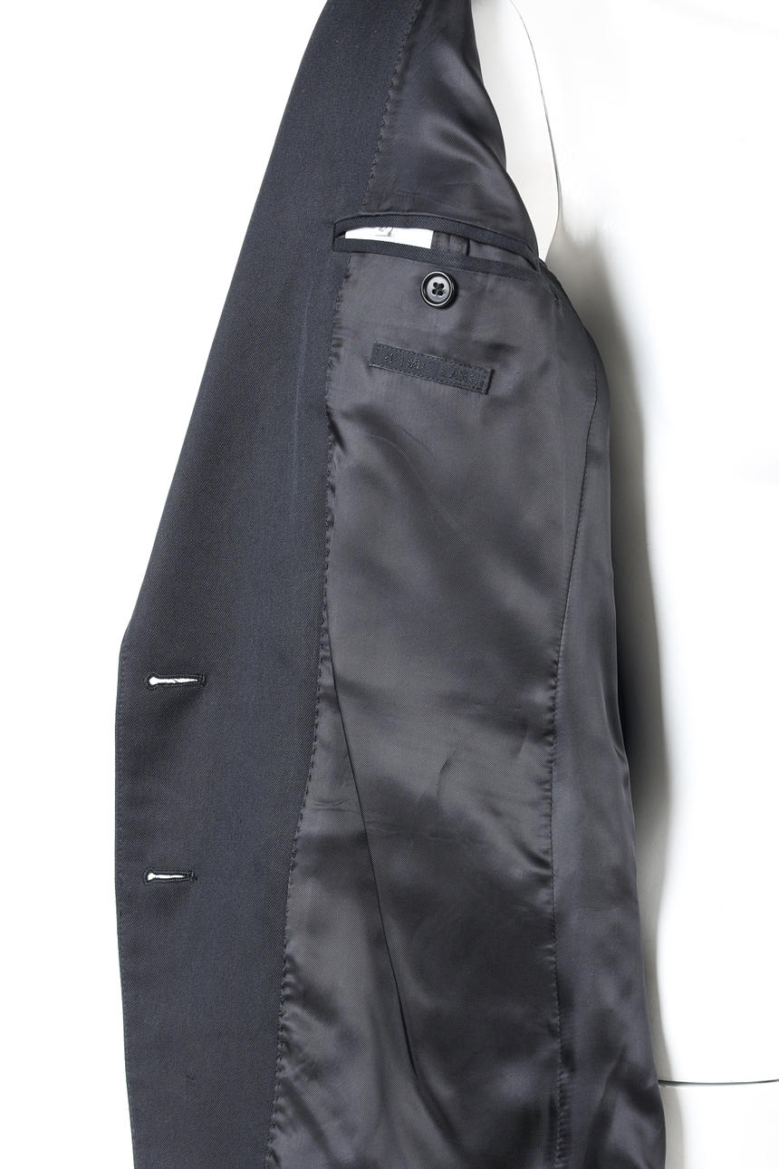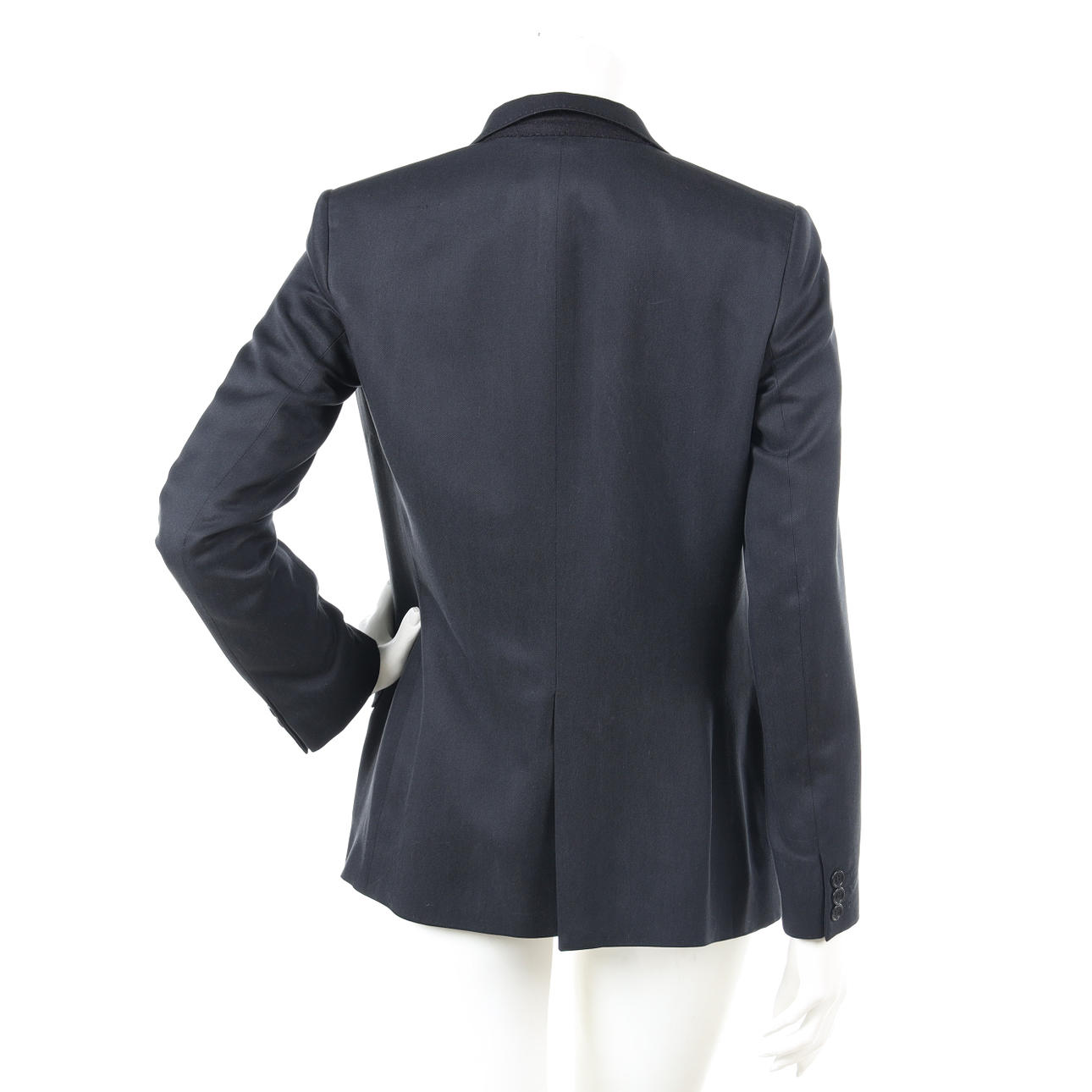 I svart siden, krage med slag, 2 knappar, bröstficka samt 2 fickor med lock, 2 innerfickor, ärmavslut med 3 knappar. Etikettmärkt HELMUT LANG, made in Italy.
