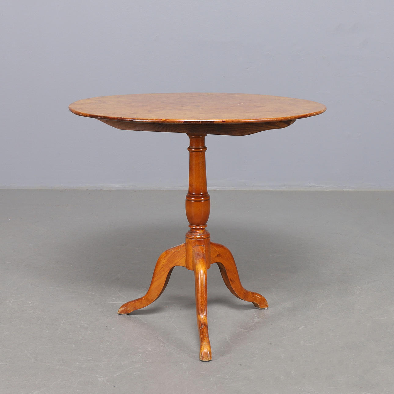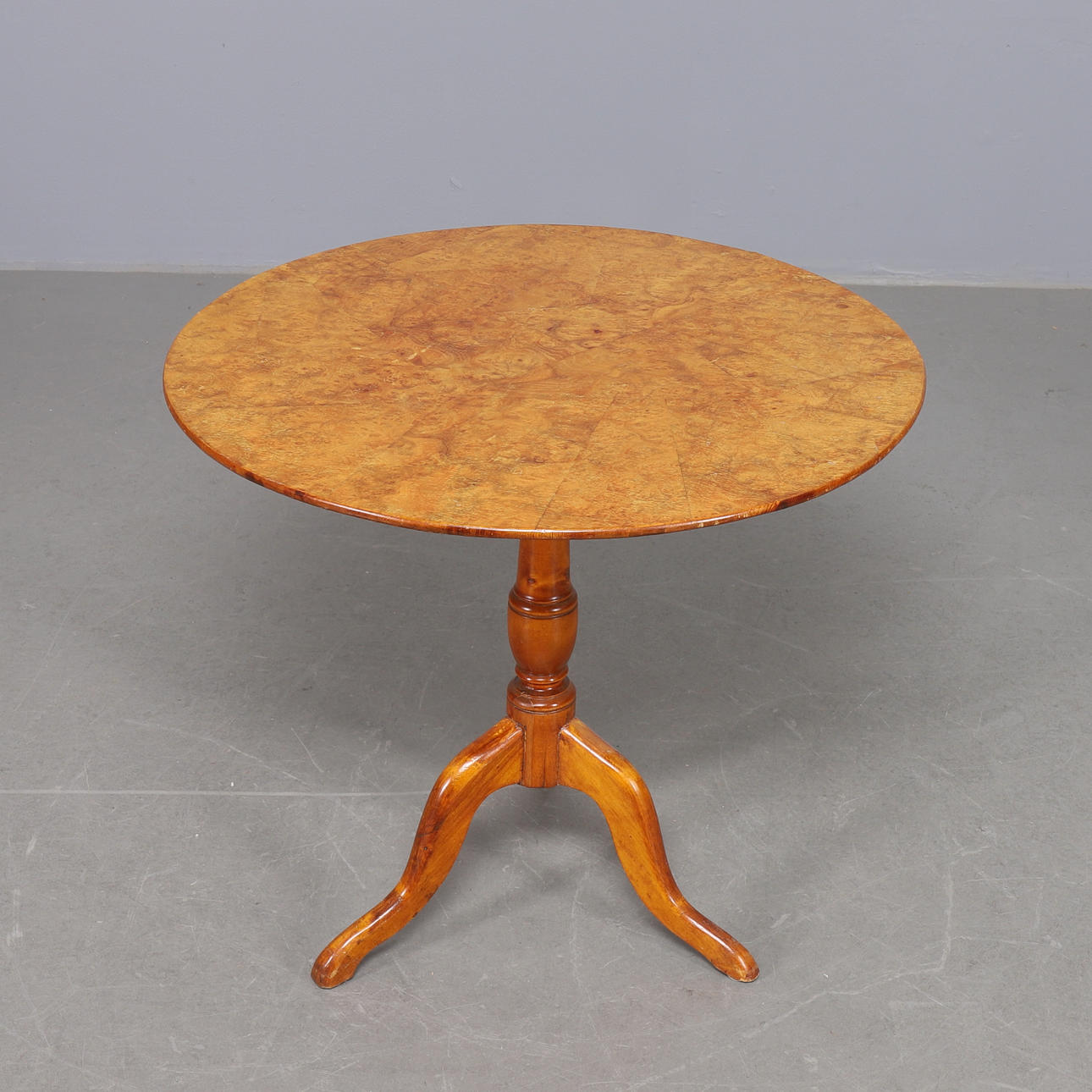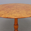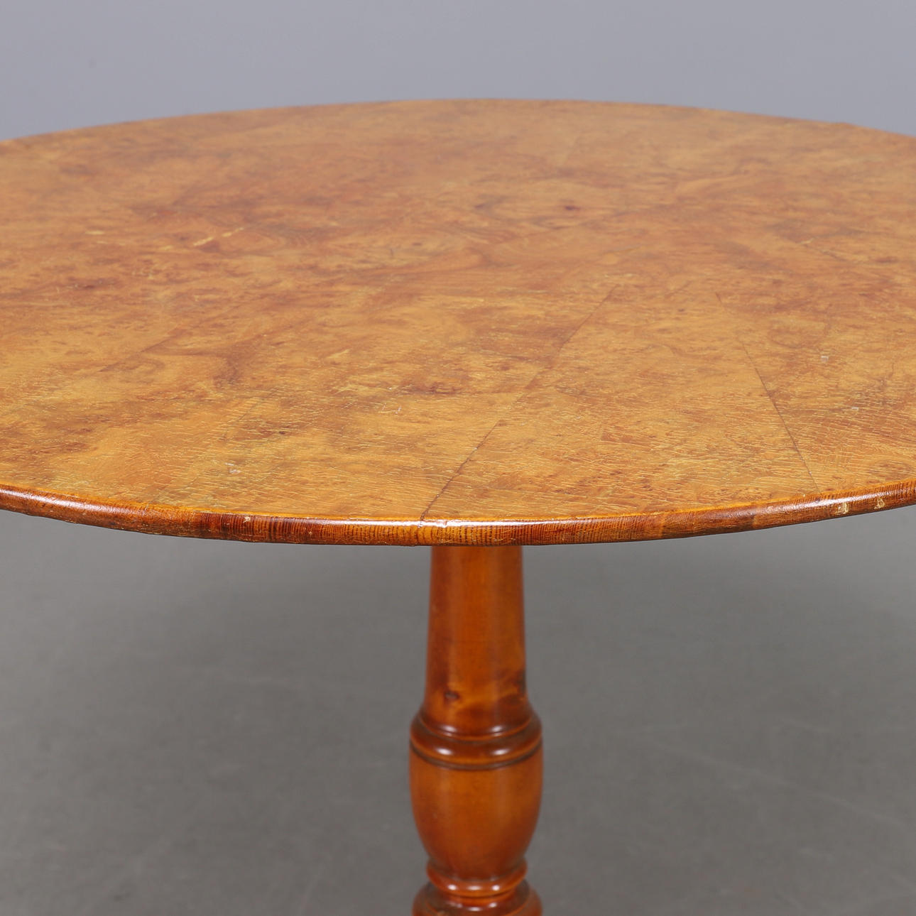 Skiva med mönsterlagd rotfanér, pelarben med trepassfot. Diameter 80 cm, höjd 74 cm.