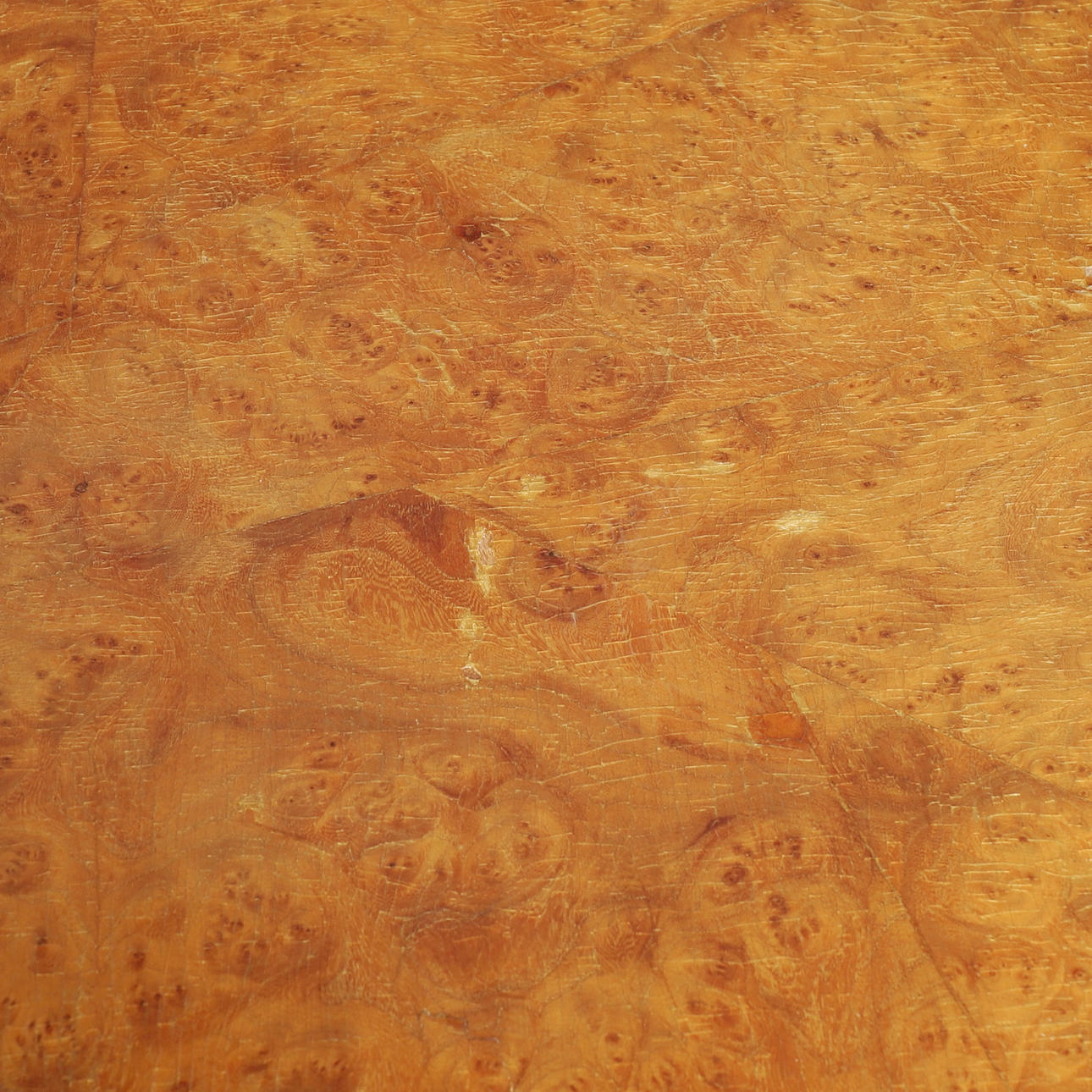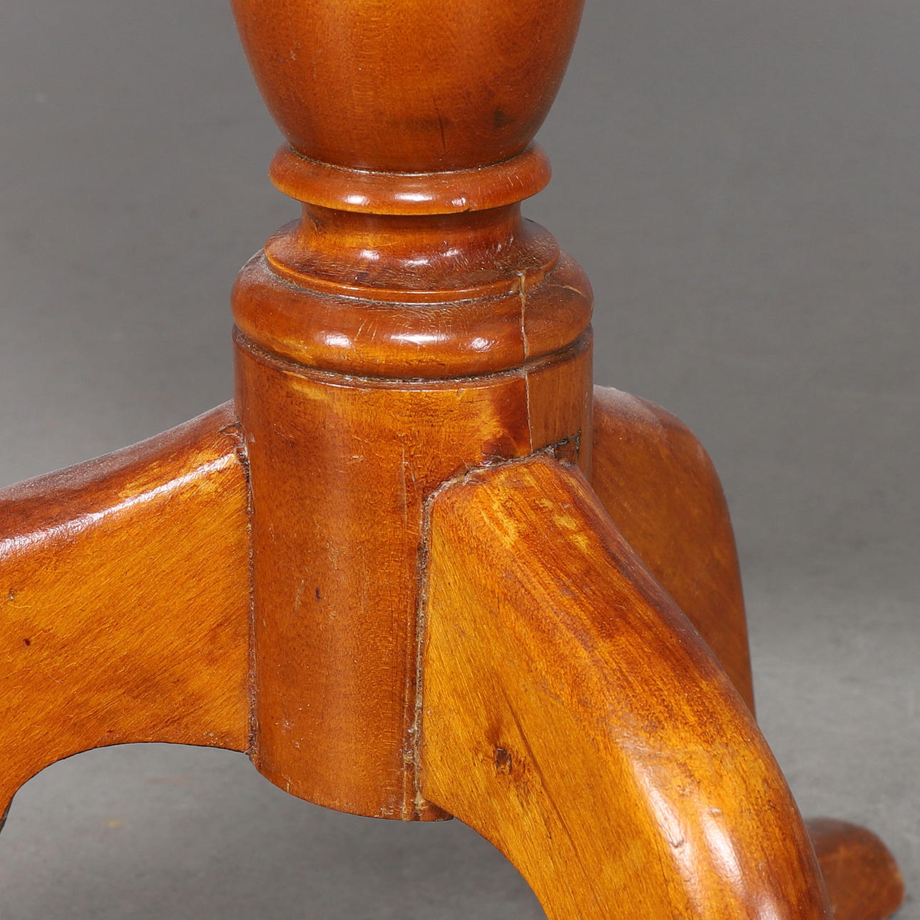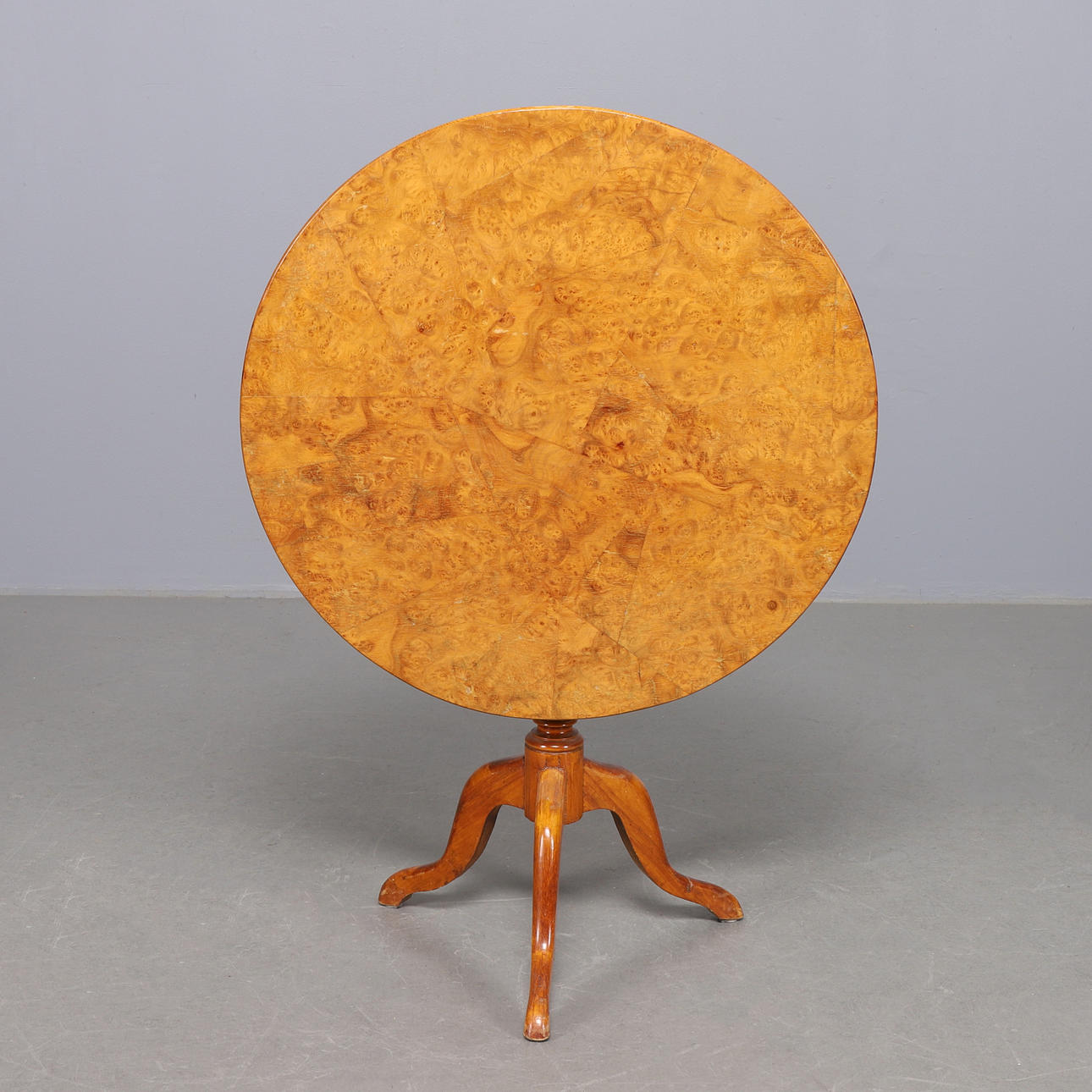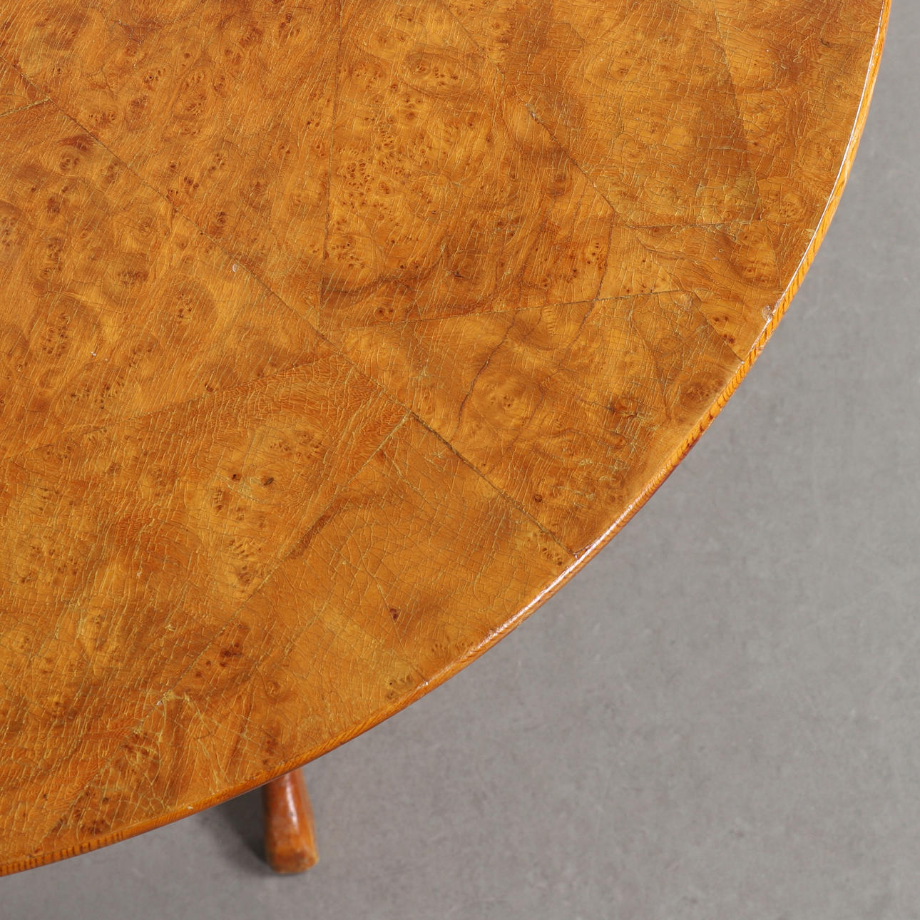 Skiva med mönsterlagd rotfanér, pelarben med trepassfot. Diameter 80 cm, höjd 74 cm.