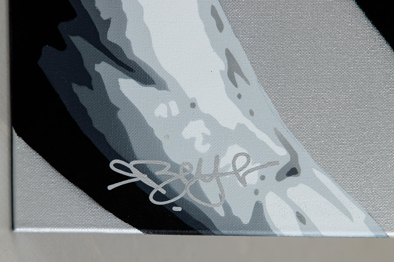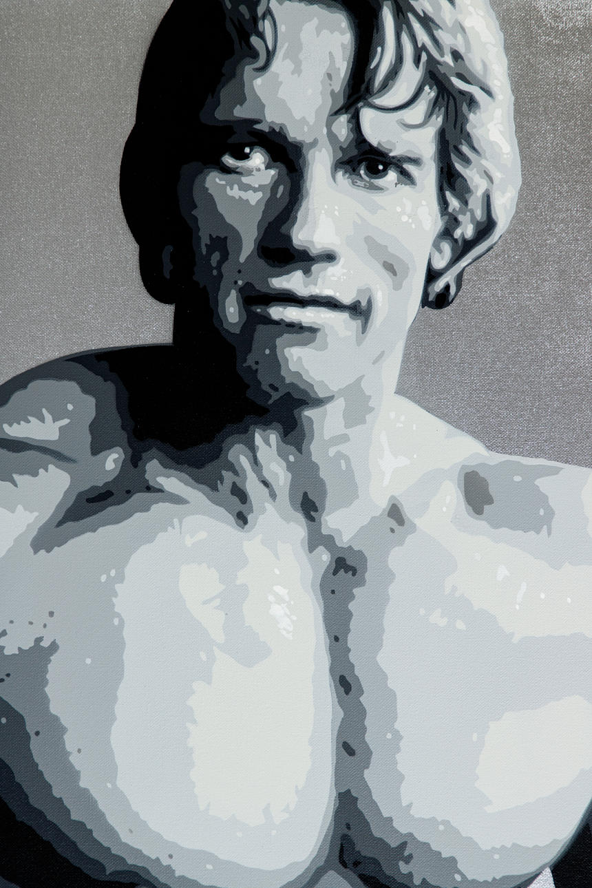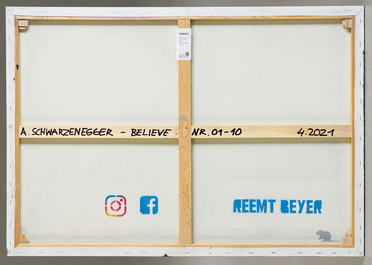 Reemt Beyer (född 1985), Arnold Schwarzenegger - Believe, flerskiktsstencil, sprayteknik/stencil på duk, 2021, signerad, daterad, numrerad och stämplad på baksidan, kopia 1/10, 70 x 100 cm.