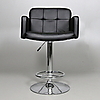 Stoppad sits, svart rutat konstläder. Höj- och sänkbar barstol med fotstöd. Kromat underrede.