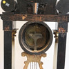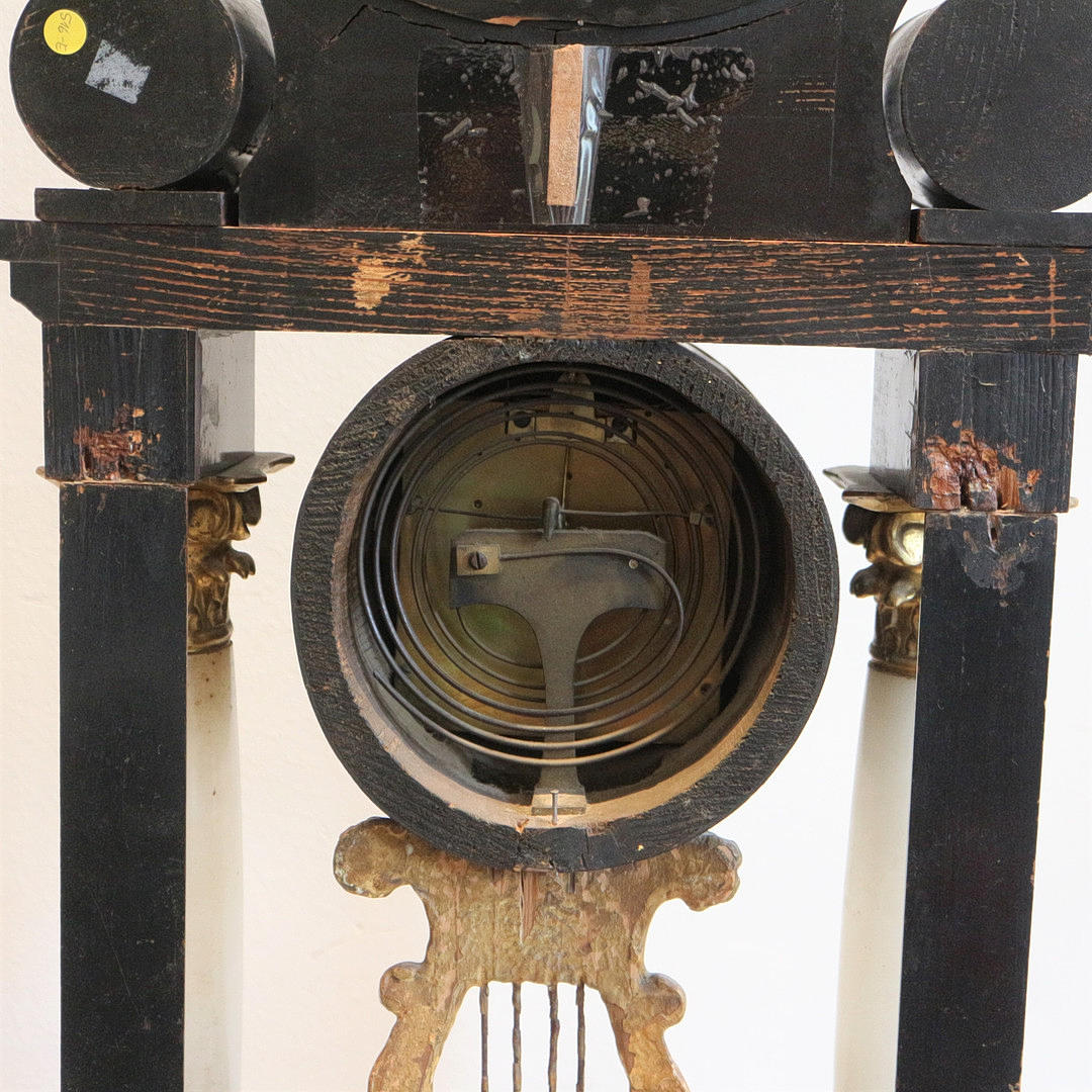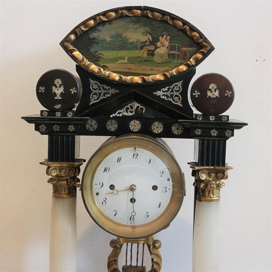 Wien portal klocka, mörkmålat fodral, alabaster kolumner, mässingsfäste. Rektangulär, kraftigt profilerad träbotten, målad svart. Dekorerad i mitten med en bronsapplikation med blommiga dekorationer. Dekorerad i mitten med en bronsapplikation med blommiga dekorationer.