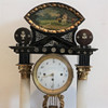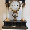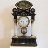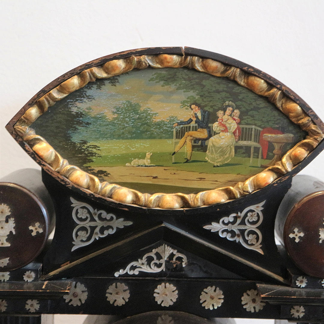 Den centrala klockan flankeras av fyra föryngrande alabaster-kolumner. Huvudstäderna och baserna är gjorda av präglat mässingsark. Ovanför rörelsen finns en arkitektonisk struktur, beskuren i mitten, med en halvcirkelformad, glaserad topp med gouache, som visar ett romantiskt landskap med figurer i förgrunden. Taklisten krönas av flera vända alabastvaser och dekorerad med pärlemorstjärnapplikationer. Rörelsen är ursprungligen glaserad, guldpläterad bronsplätering, med en handmålad emaljurtavla med tre rörelser.