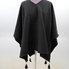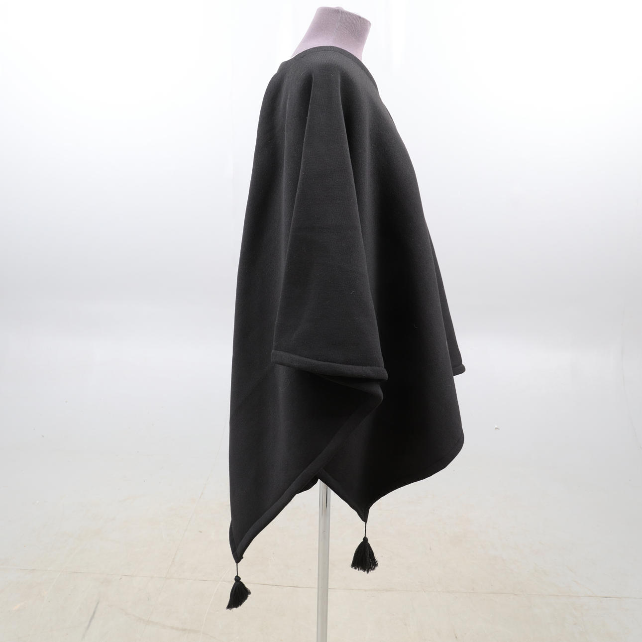 Poncho i svart fleece, handgjord av FIN AWA Silverkantand halsringning, 4 tofsar fästa i nederkanterna.