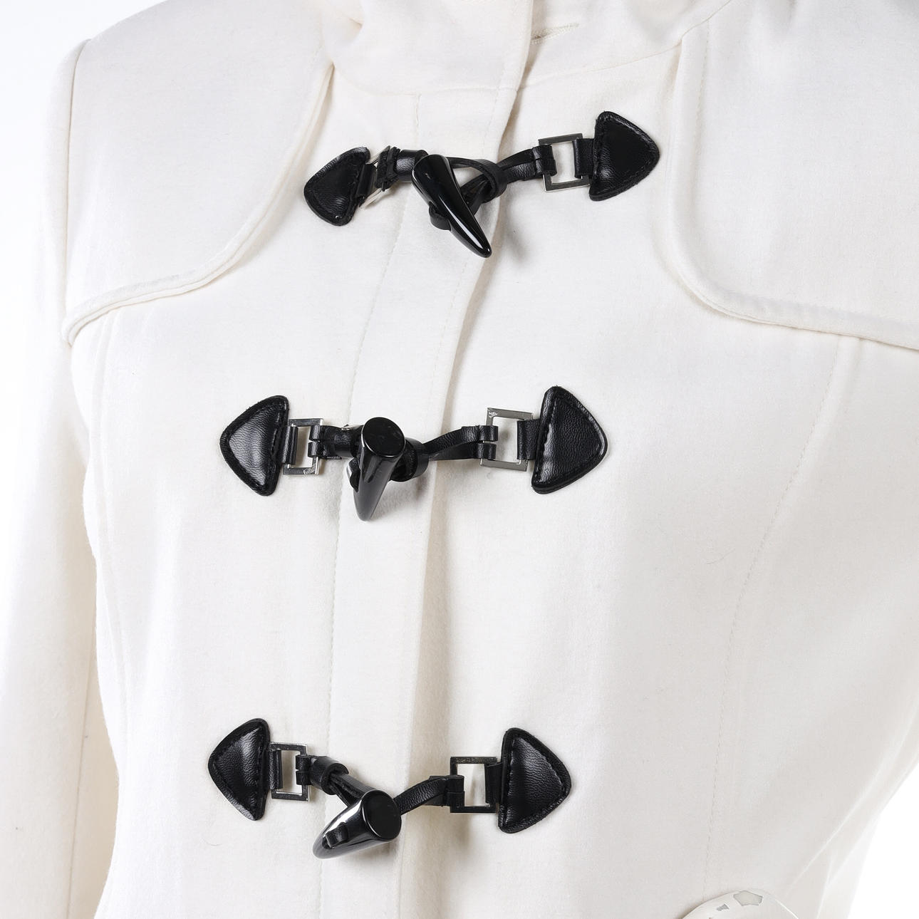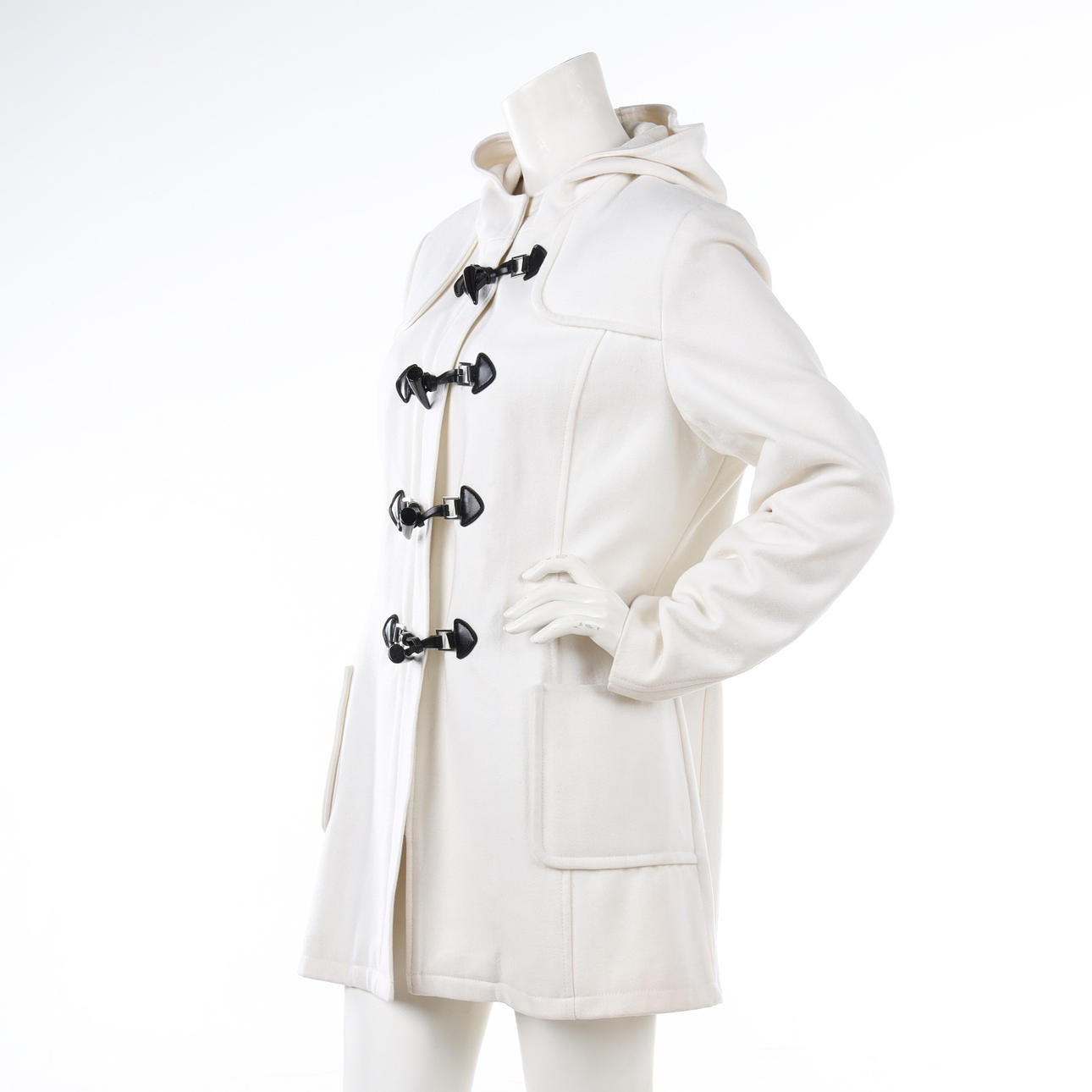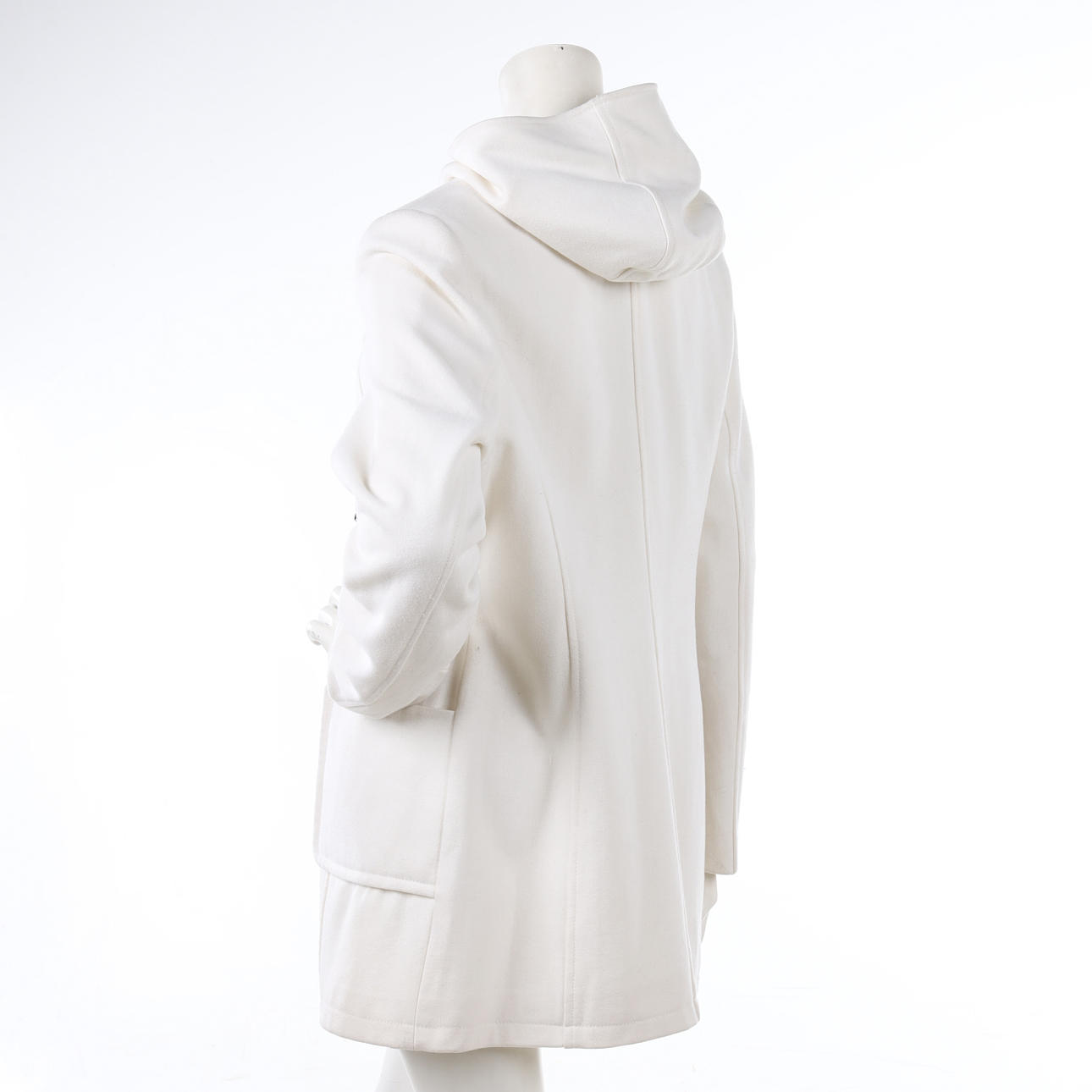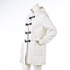 Duffel i ullmix, knäppes med blixtlås samt duffelknäppning med detaljer i konstläder, två utanpåliggande fickor, kapuschong, något figursydd i rygg, Storl 40, rygglängd ca 80 cm, bystvidd ca 95 cm, ärmlängd ca 62 cm.