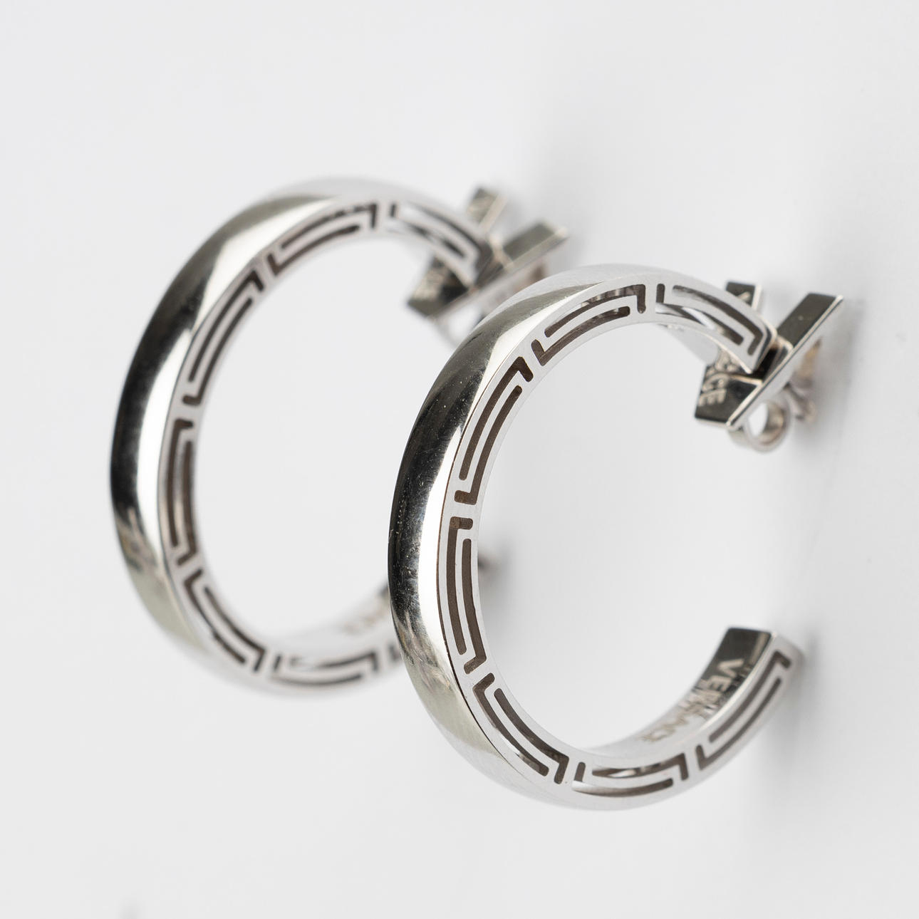 18K vitguld, diameter 28 mm, stiftlås, vikt totalt13,5 g.