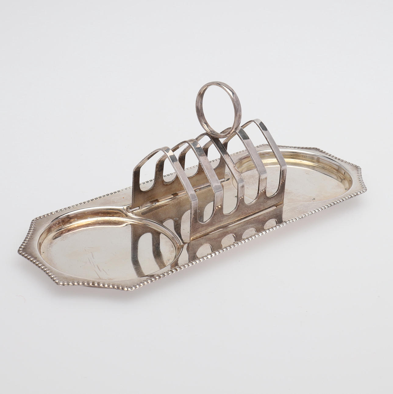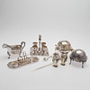 Toastrack, brevsprätt, såskanna, två karotter med huv, salt- och pepparströare i form av pingviner samt set med bricka, äggkoppar samt skedar.