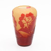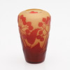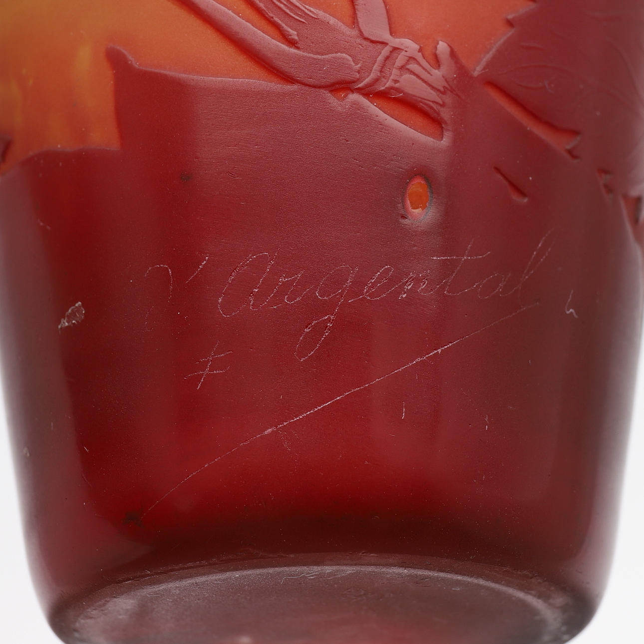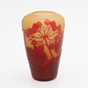Överfångsglas i gult och rött med etsad dekor av växtlighet, Frankrike, 1900-talets första fjärdedel, höjd 11,5 cm.