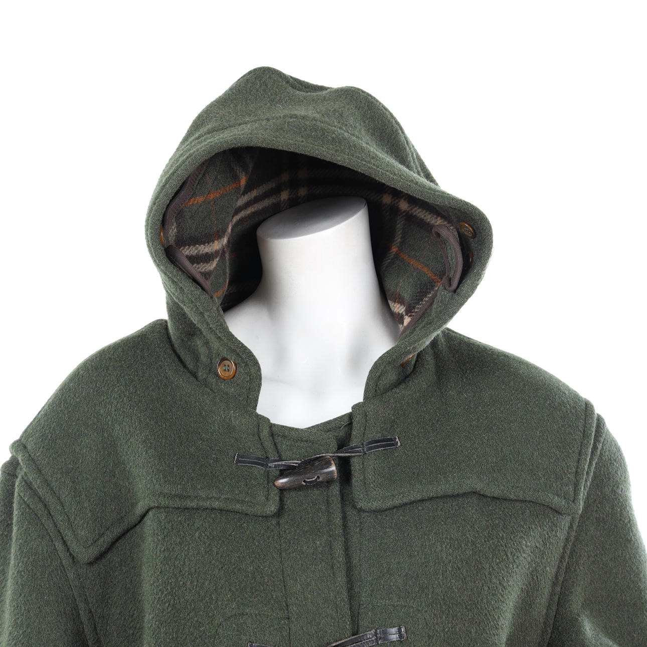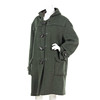 I mossgrön ull, kapuschong, duffelknäppning, utanpåliggande fickor med lock, Storl ca 42, rygglängd ca 100 cm, bystvidd ca 120 cm, ärmlängd ca 63.