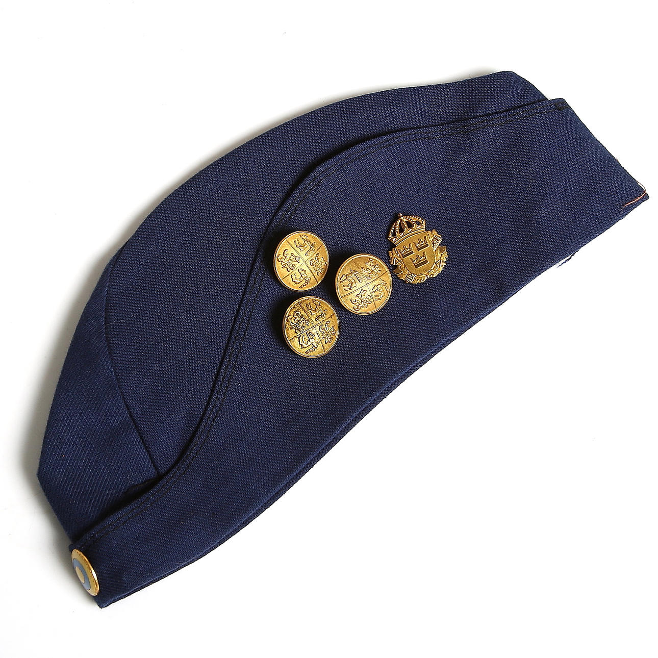 Tre granhylsor, caliber 47, höjd 31 cm. Båtmössa, flygvapnet, stl 54. Knappar och mössmärke, Polis.