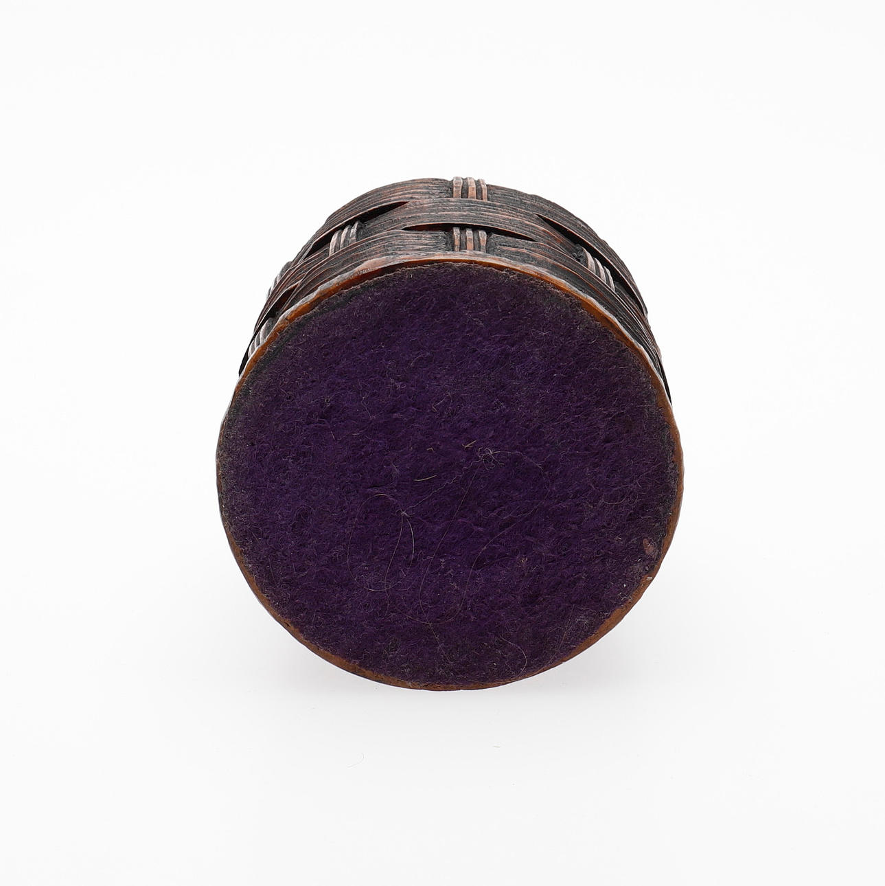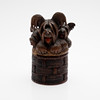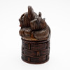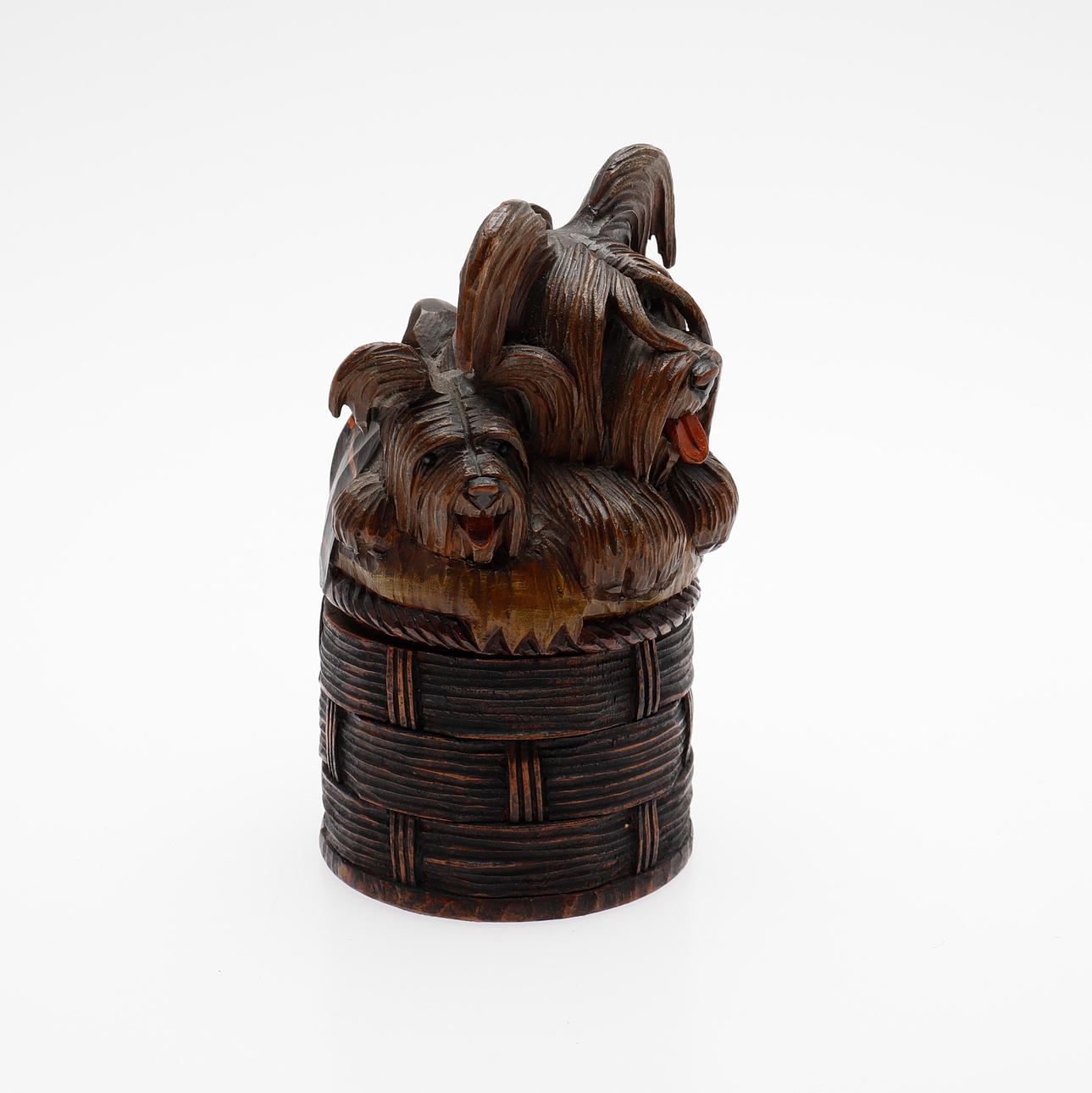 I form av korg med tre yorkshireterriers, sannolikt Schwartzwald 1900-talets första hälft, höjd 16,5 cm.