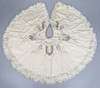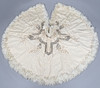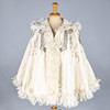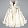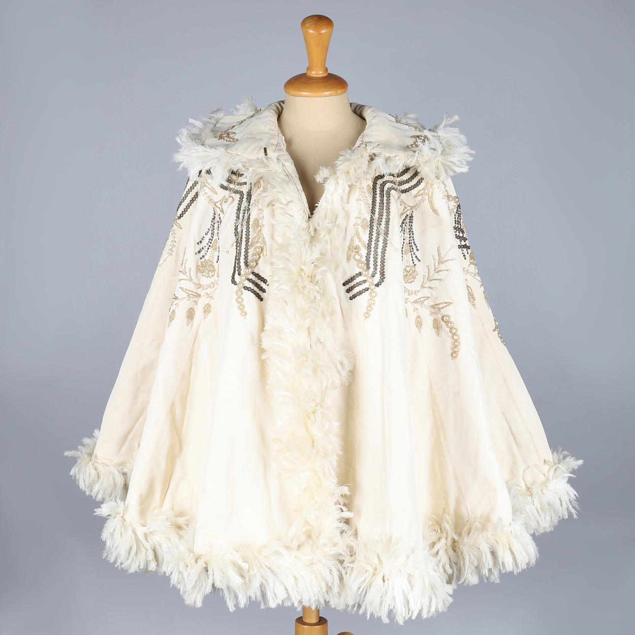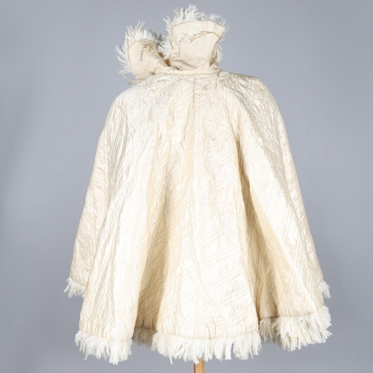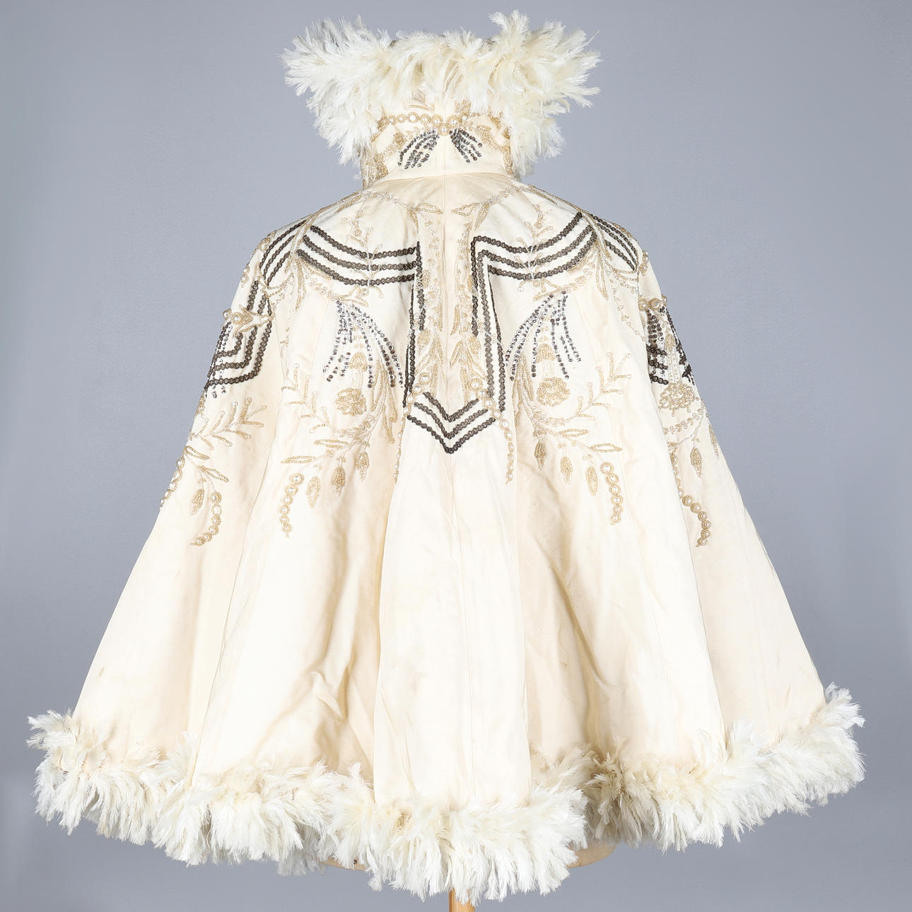 med pärl- och paljettbroderi i guld, vit och brons, kantad med vita fjädrar, fäst med metallkrokar, vit quiltad silkesfoder. Längd ca 65cm, max bredd ca 145cm.