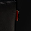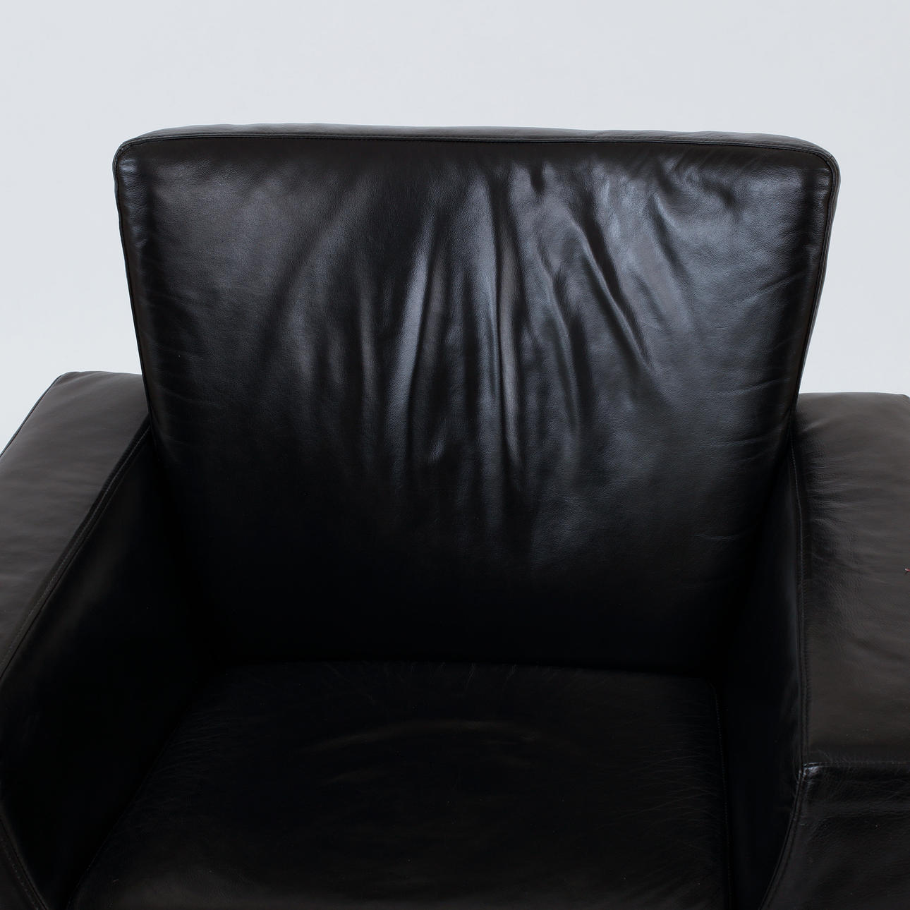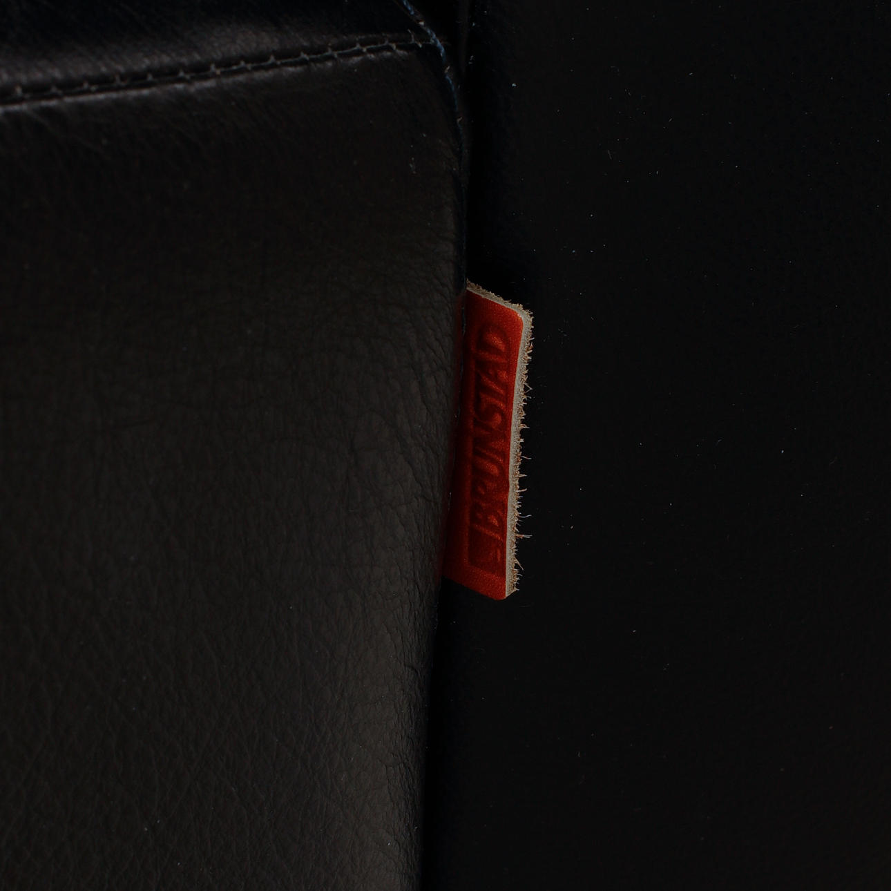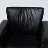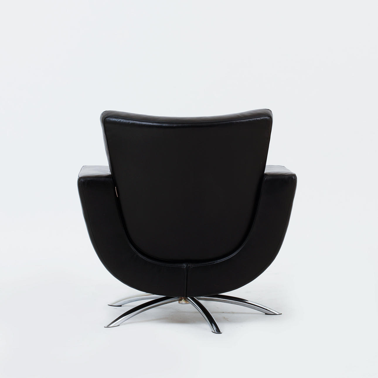Sits klädd i svart skinn på femdelad fot. Etikettmärkt. Sitthöjd, 45 cm. Sittdjup, 50 cm.