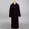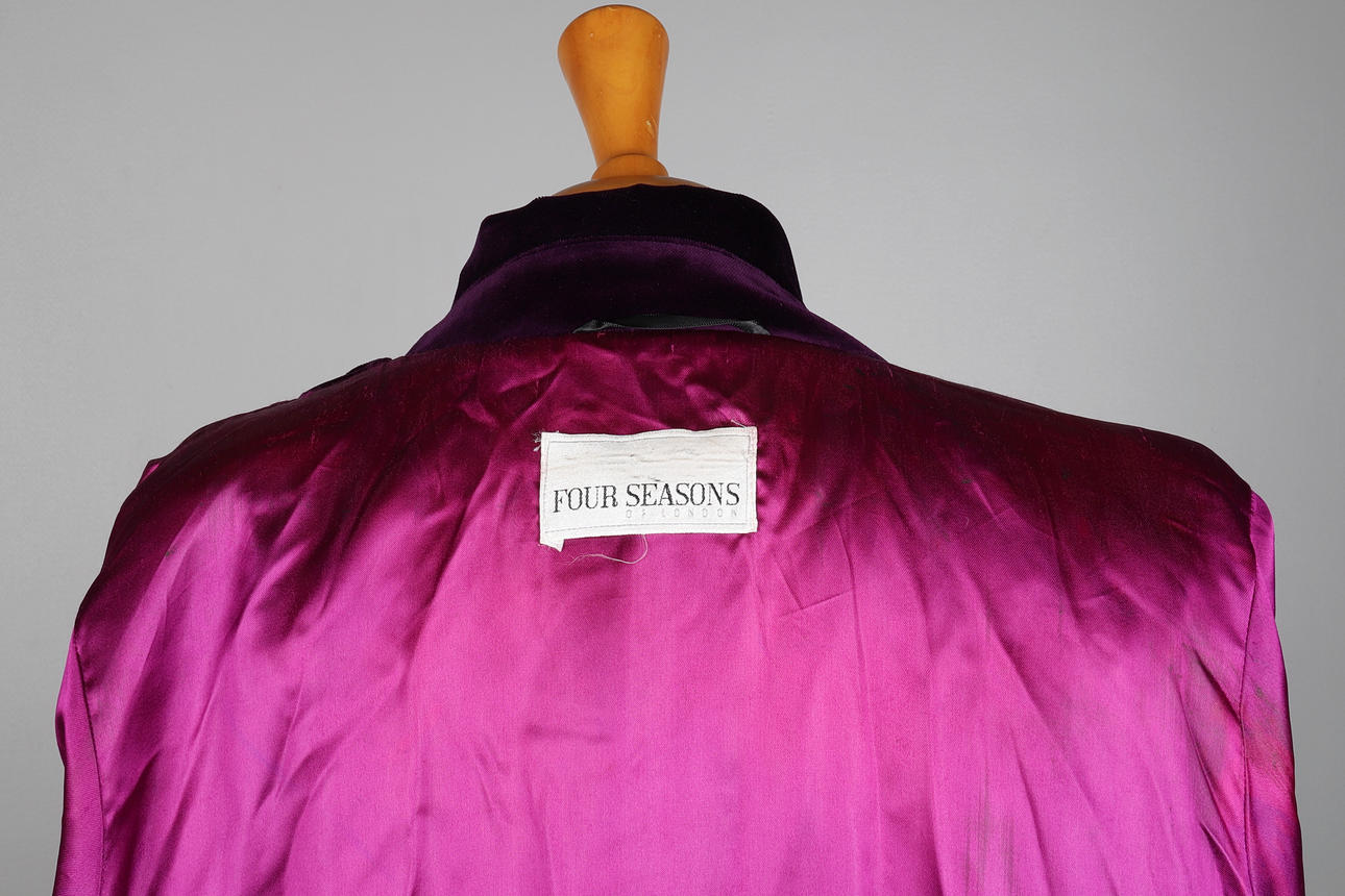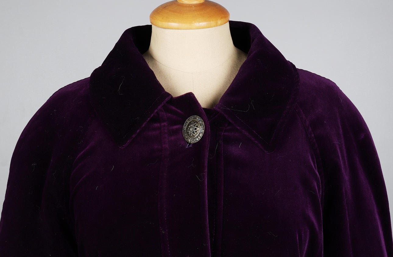 Lös silhuett med spetsig krage, raglanärmar med axelvaddar, knäppning med fem blom dekorerade metallknappar, märkt Four Seasons of London och med lila acetat foder, mått L. Rygglängd ca 130cm, byst ca 120cm, armlängd 43cm.